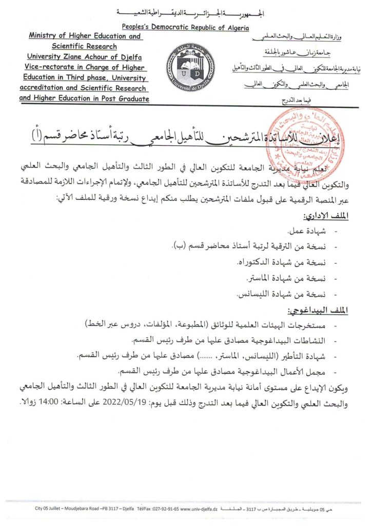 إعلان للأساتذة المترشحين للتأهيل الجامعي رتبة أستاذ محاضر قسم “أ”
