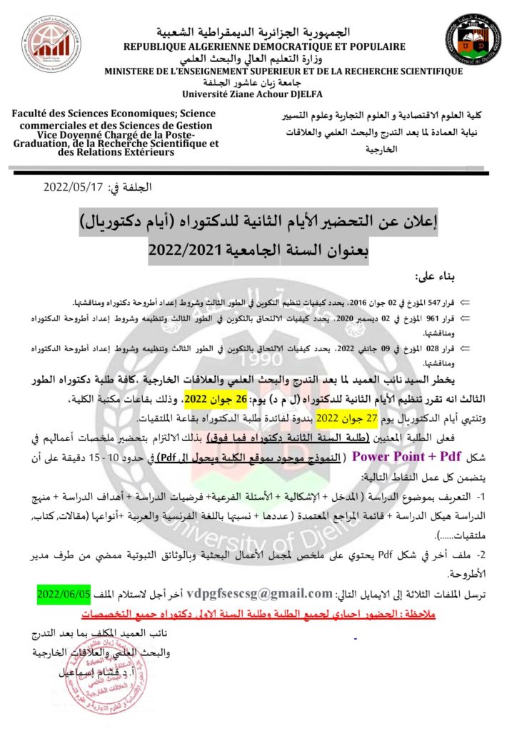 إعلان عن التحضير الايام الثانية للدكتوره(أيام دكتوريال) بعنوان السنة الجامعية 2022/2021 ملصق الدكتوراه