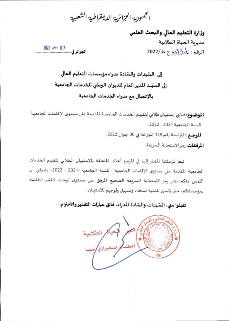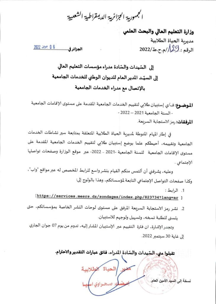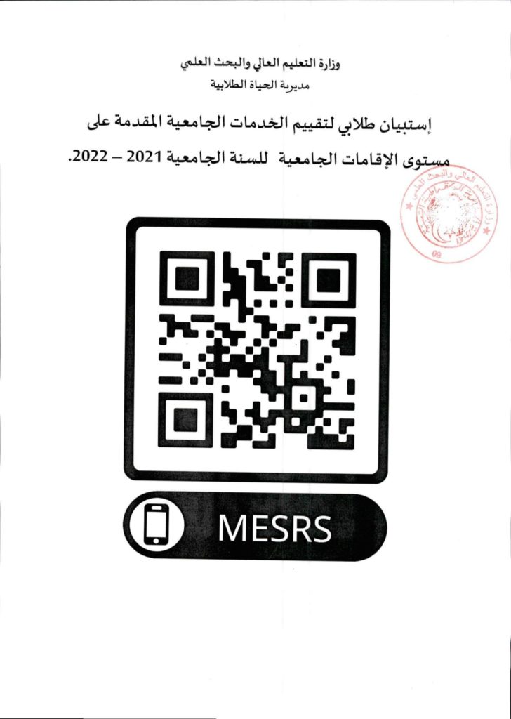 إستبيان طلابي لتقييم الخدمات الجامعية على مستوى الإقامات الجامعية للسنة الجامعية 2021-2022 رابط الاستبيان: https://services.mesrs.dz/sondages/index.php/823734?lang=ar