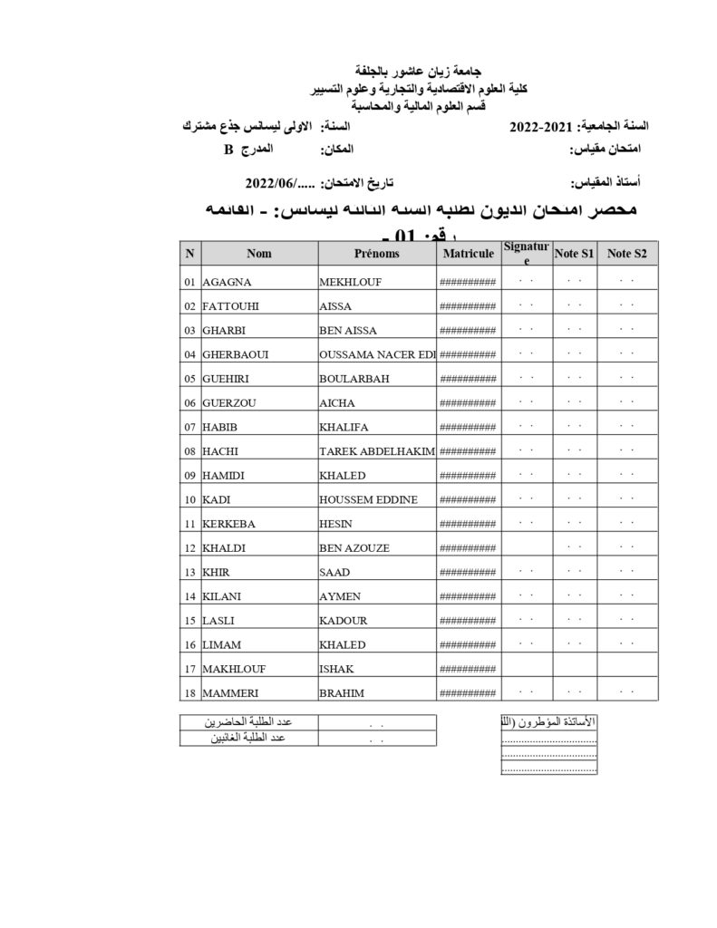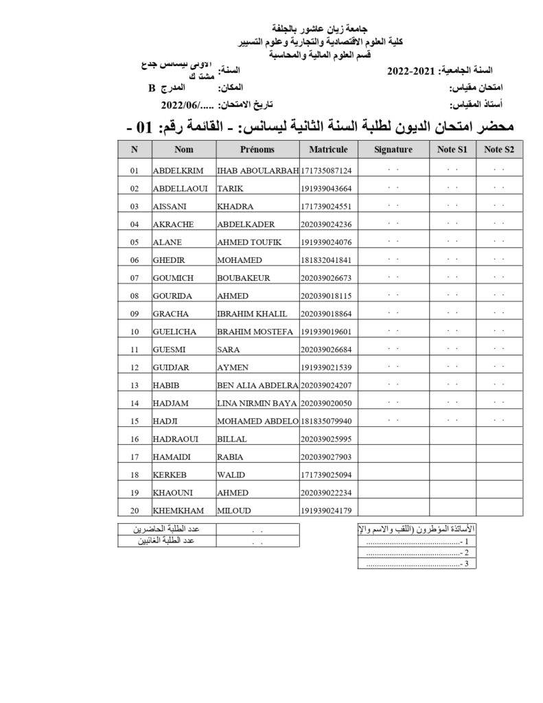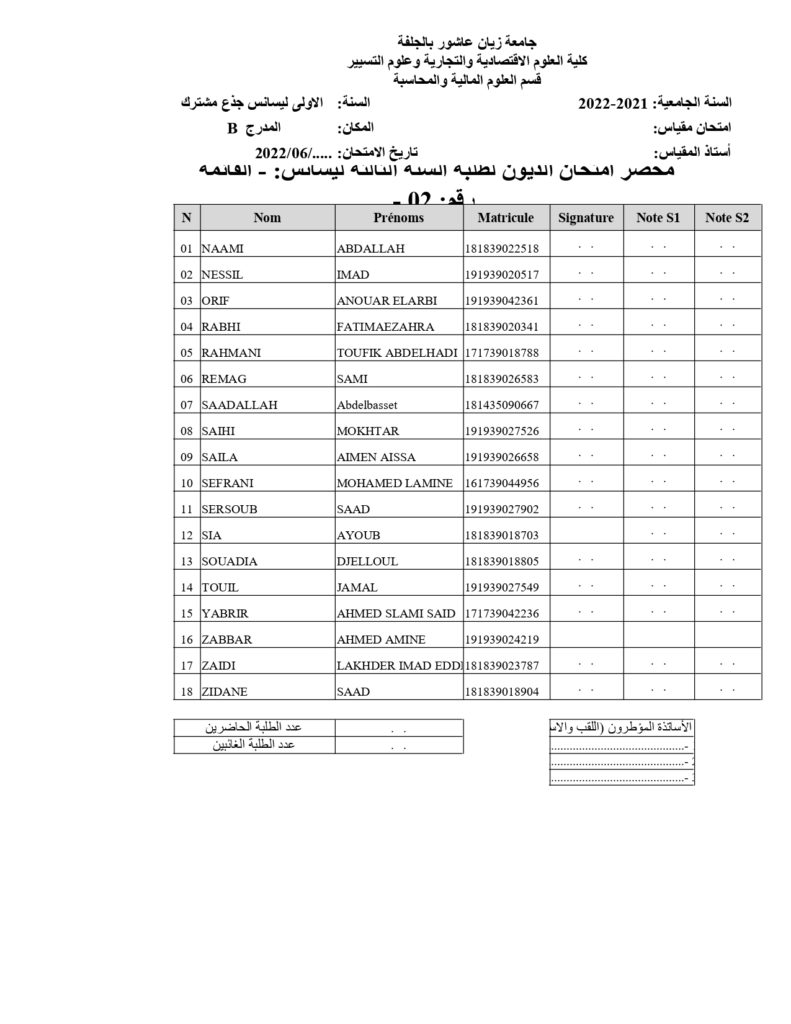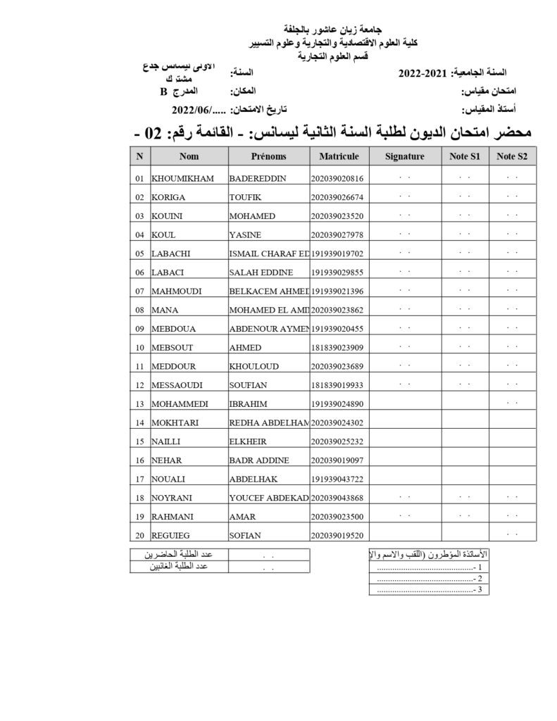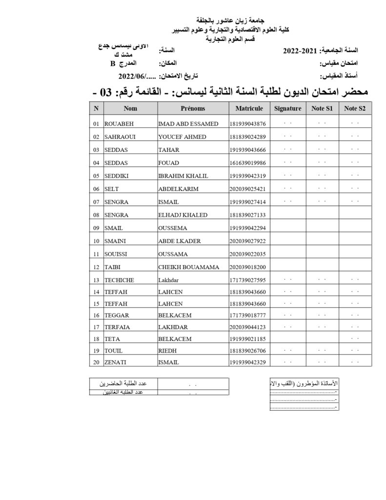 قوائم طلبة السنة( ثالثة + الثانية ) علوم تجارية المعنيين بديون السنة أولى جذع مشترك على الطلبة المذكورين في القوائم اتباع رزنامة امتحانات السنة أولى جذع مشترك ديون للسنة الجامعية 2021-2022 ملاحظة : طلبة قسم العلوم التجارية المدرج ب
