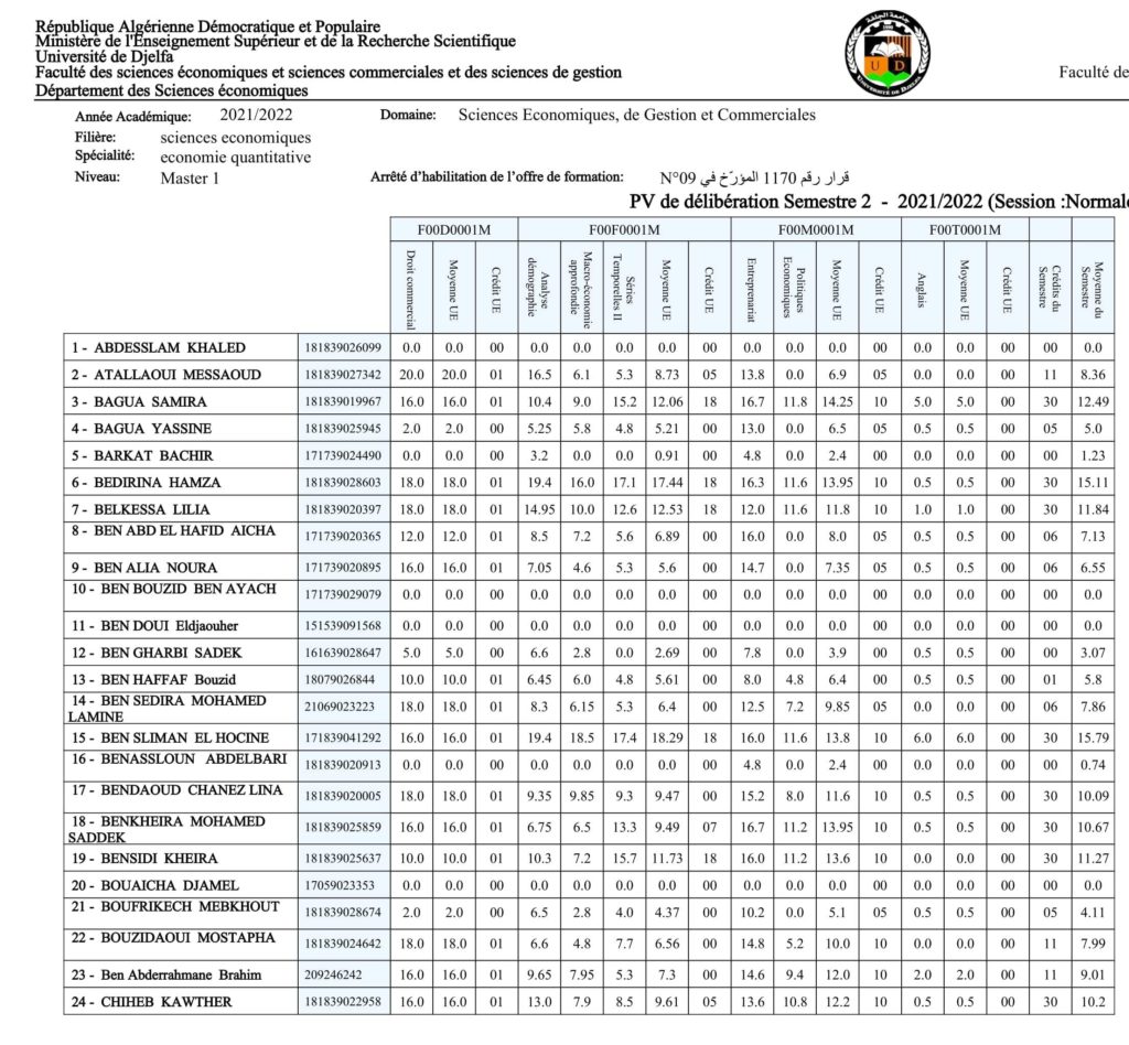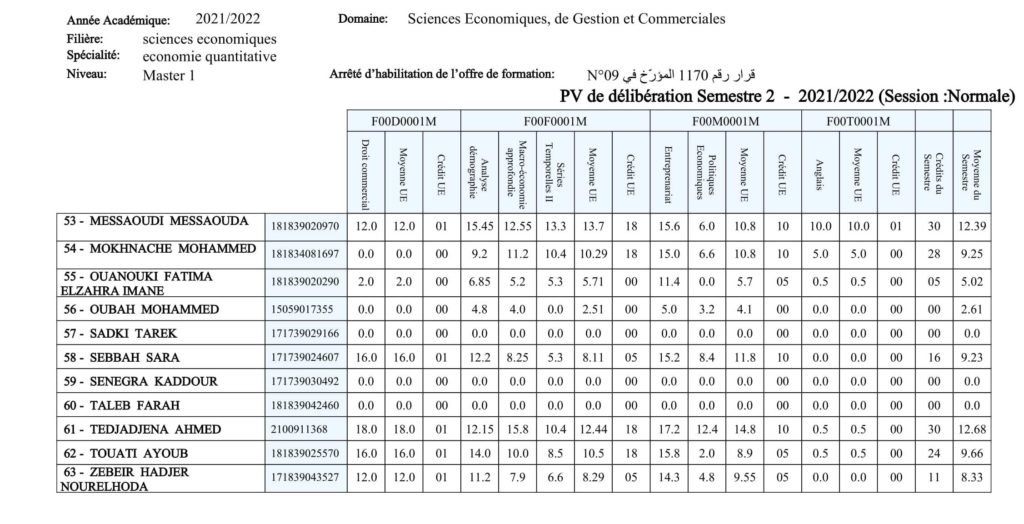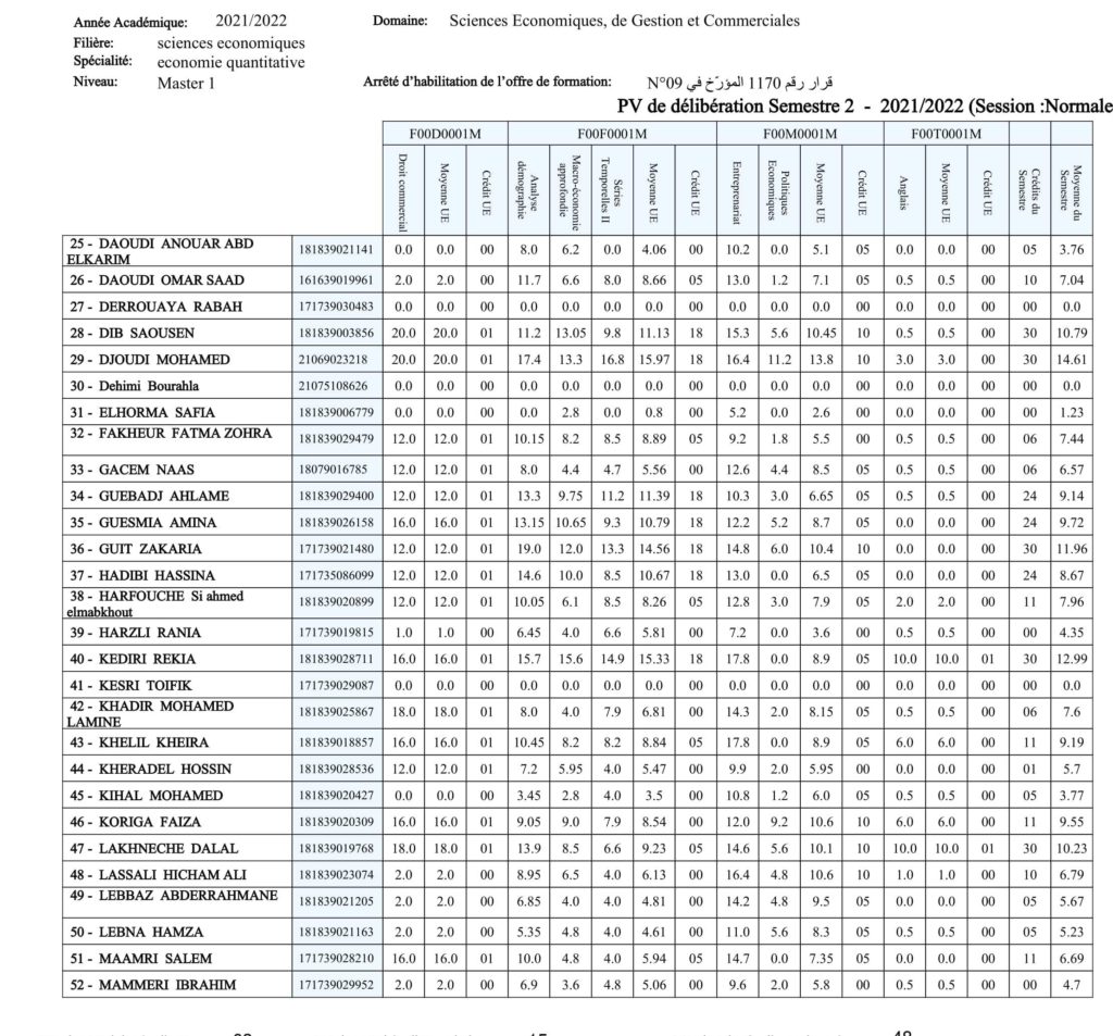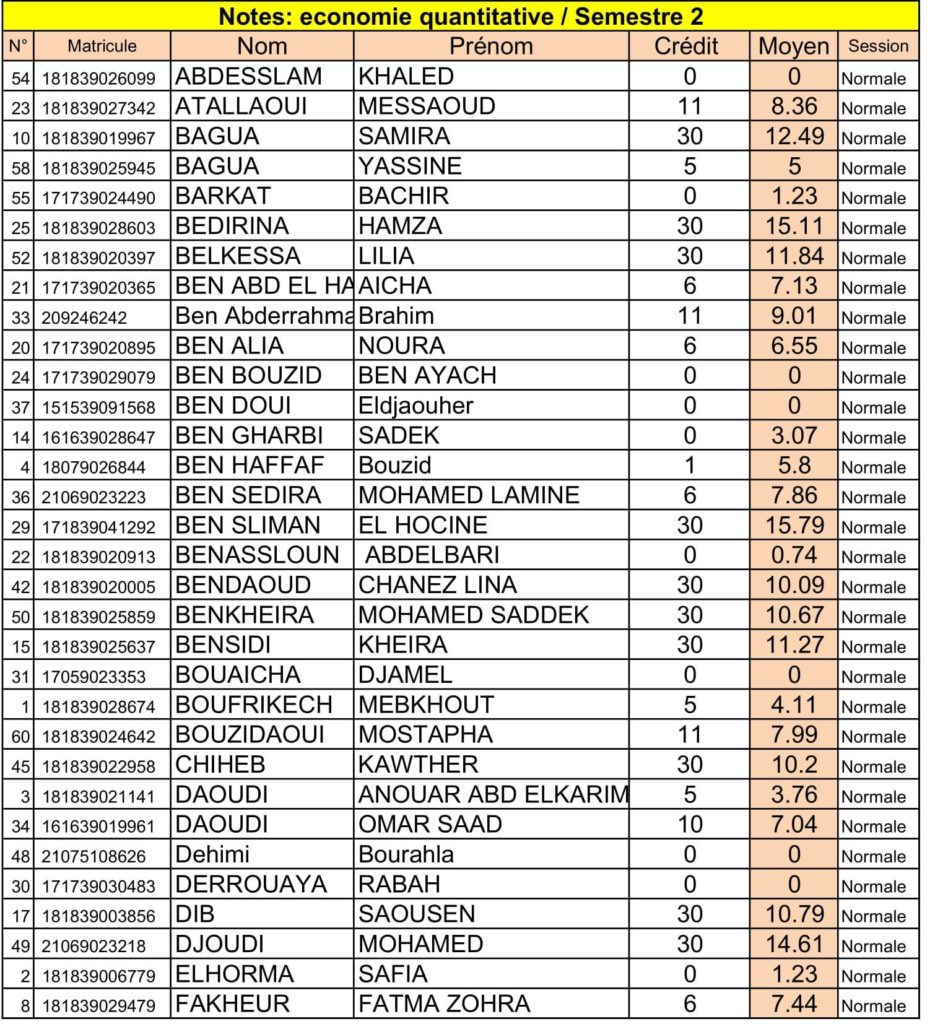 نتائج السداسي الرابع للسنة 01 ماستر تخصص اقتصاد كمي علوم اقتصادية- قبل الطعون علامات مقاييس – السداسي الثاني للسنة 01 ماستر تخصص اقتصاد كمي – قبل الطعون