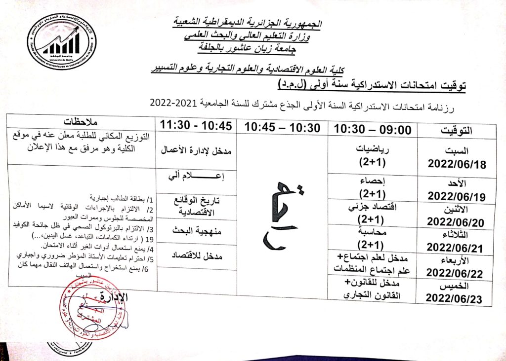 رزنامة الامتحانات الاستدراكية السنة أولى جذع مشترك للسنة الجامعية 2022/2021