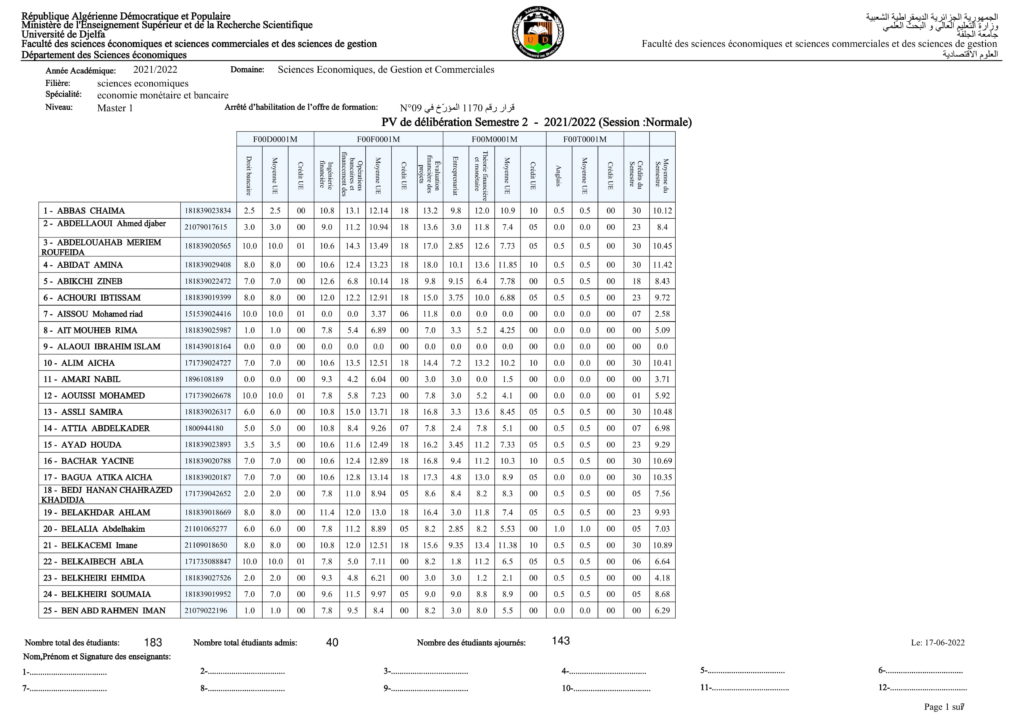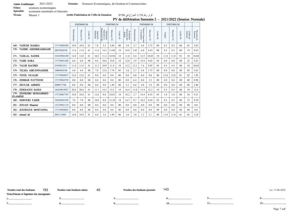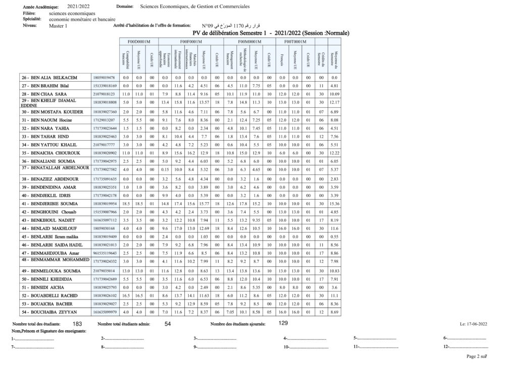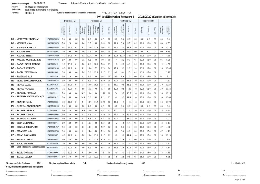 نتائج السداسيين 1+2 – للسنة أولى ماستر – اقتصادي نقدي وبنكي – بعد معالجة الطعون للسنة الجامعية 2022/2021