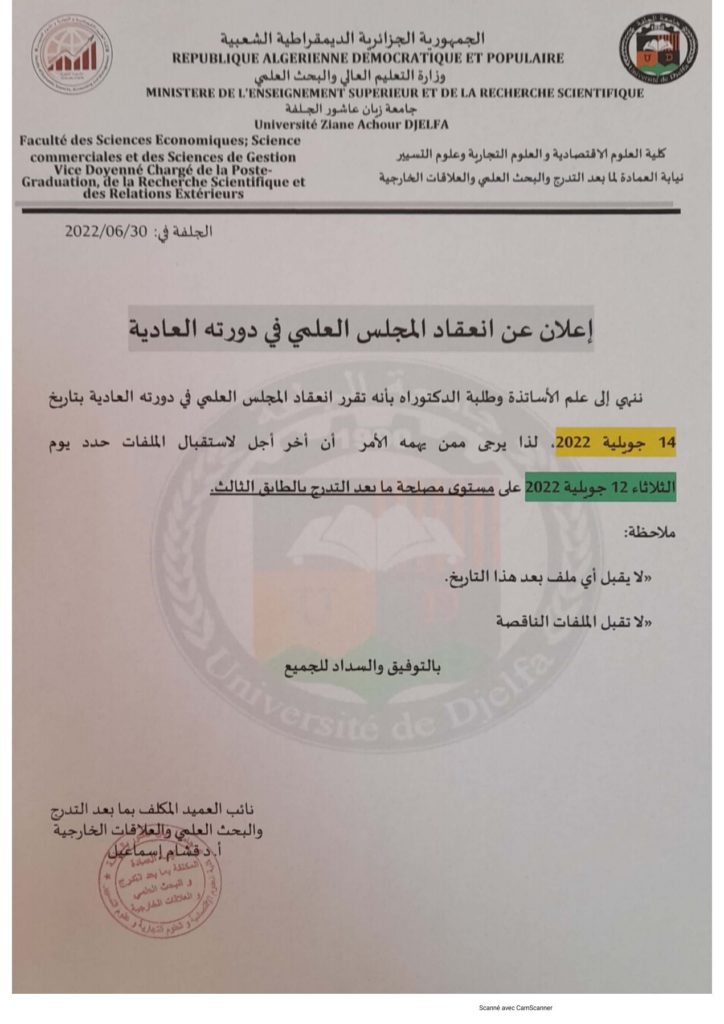 إعلان عن إنعقاد المجلس العلمي في دورته العادية