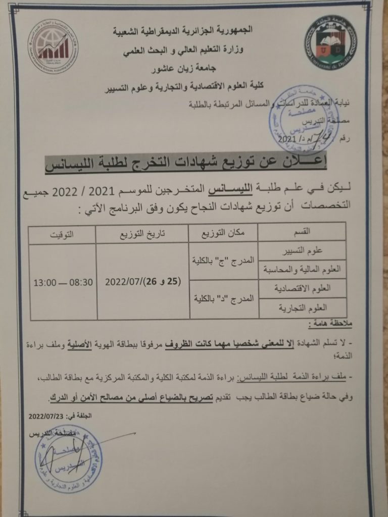 إعلان عن توزيع شهادات التخرج لطلبة الليسانس