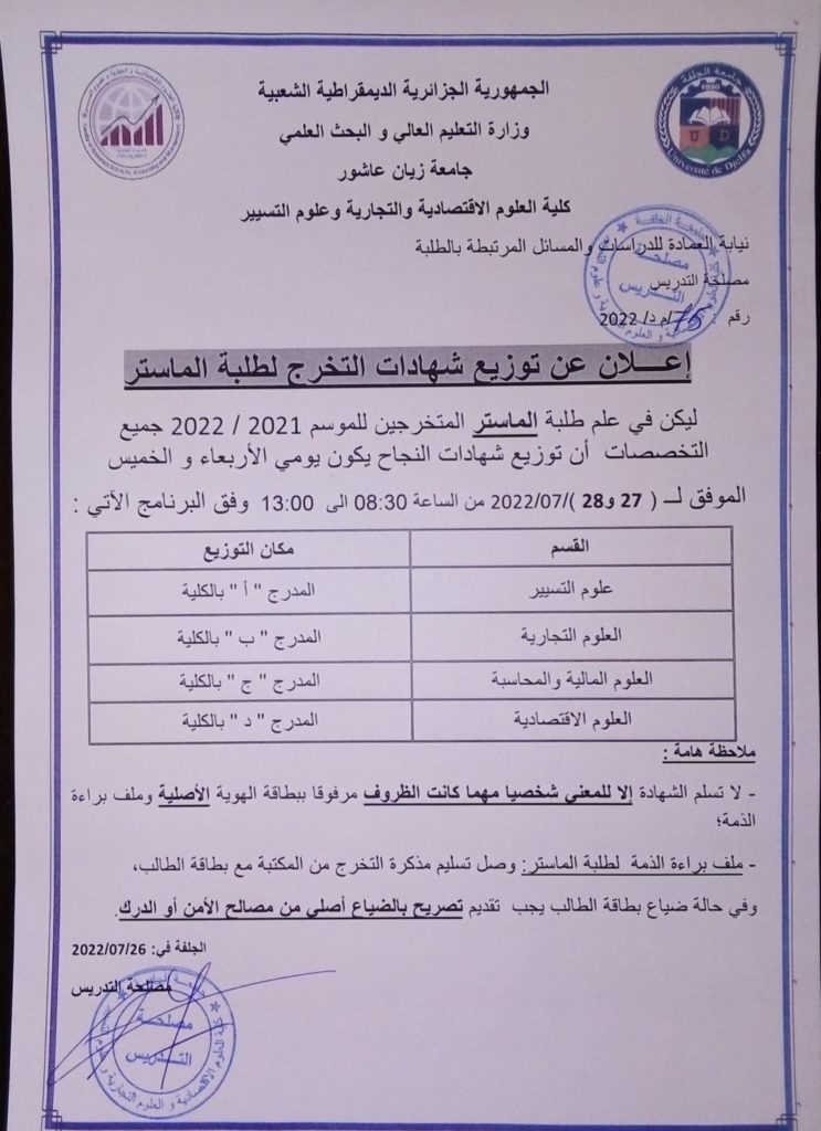 إعلان عن توزيع شهادات التخرج لطلبة الماستر