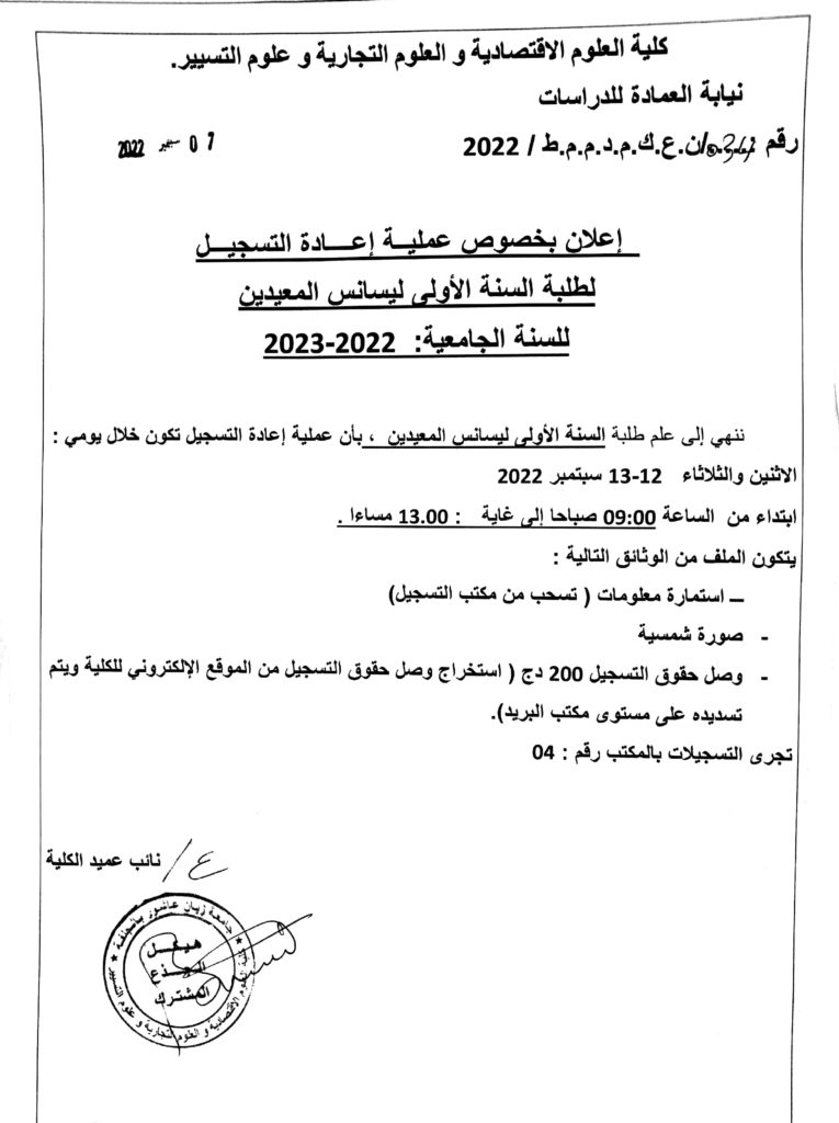 إعلان لطلبة السنة اولى ليسانس المعيدين بخصوص عملية إعادة التسجيل للسنة الجامعية 2022/2023