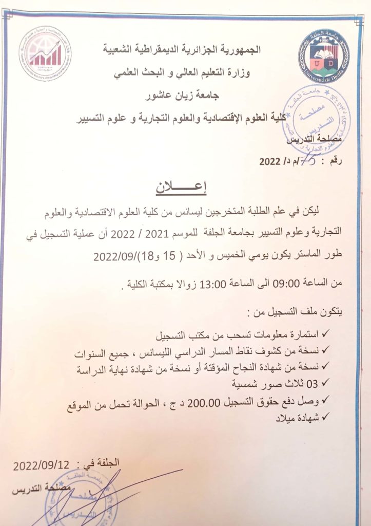 إعلان للطلبة المتخرجين ليسانس من كلية العلوم الاقتصادية والتجارية وعلوم التسيير بجامعة الجلفة للموسم 2021/2022 بخصوص عملية التسجيل في طور الماستر