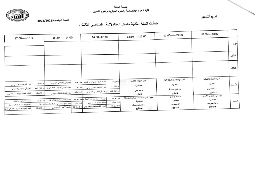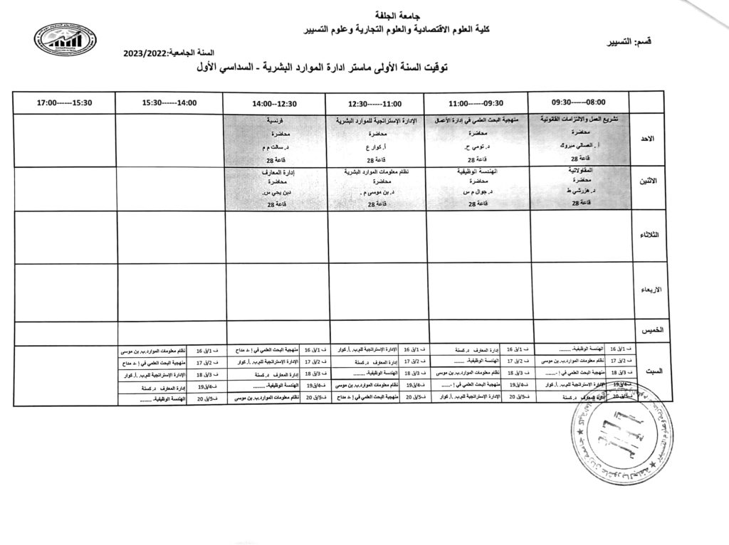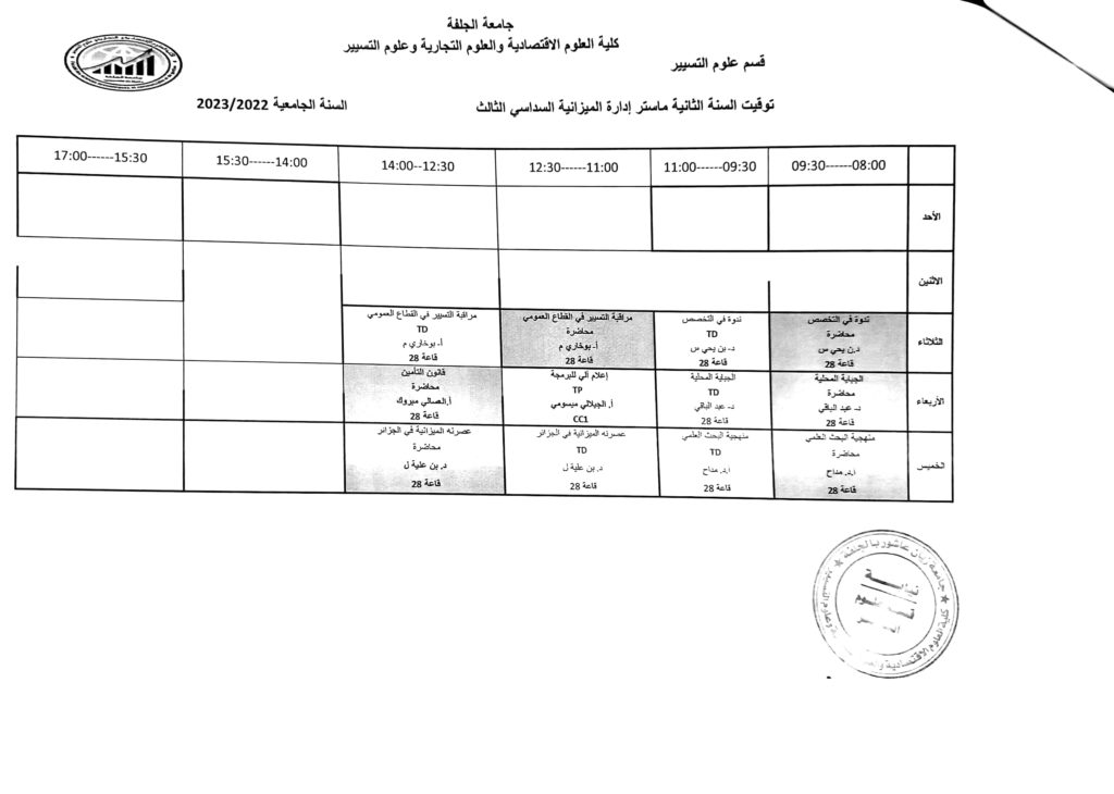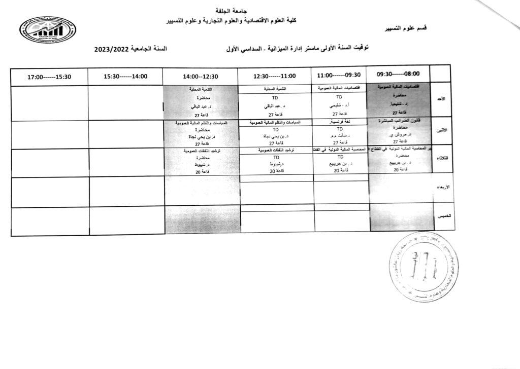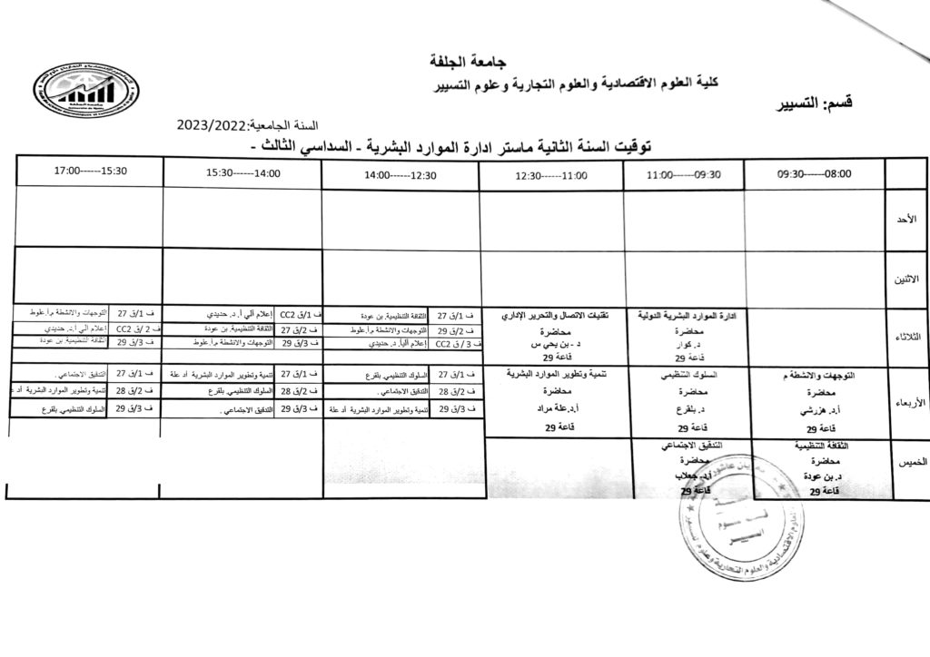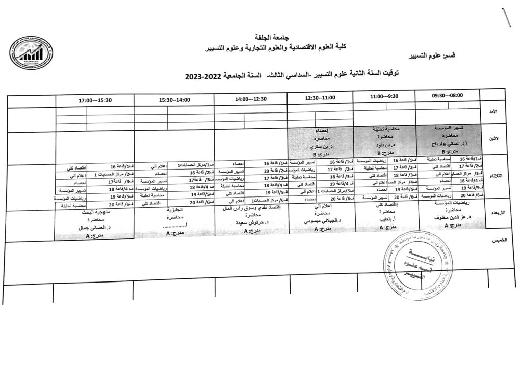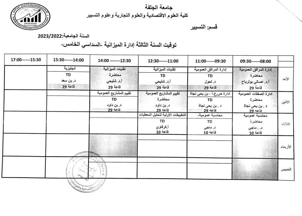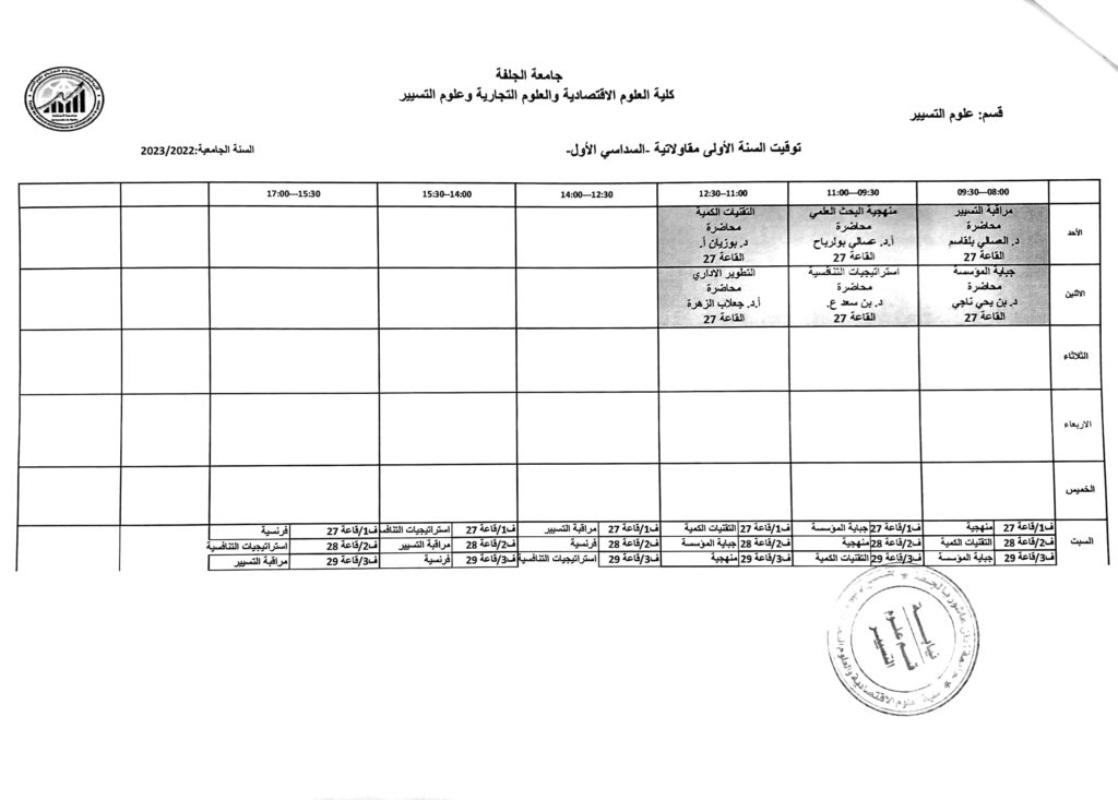 توقيت السداسي الاول للسنة الجامعية 2022-2023 لطلبة قسم علوم التسيير جميع المستويات