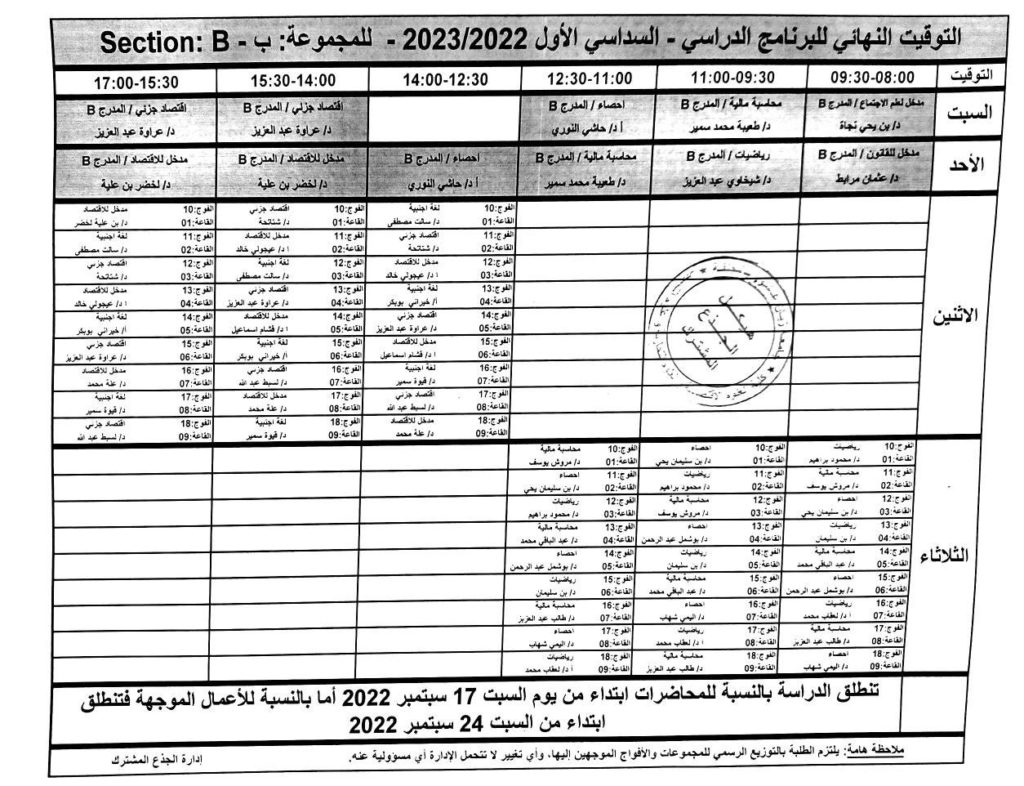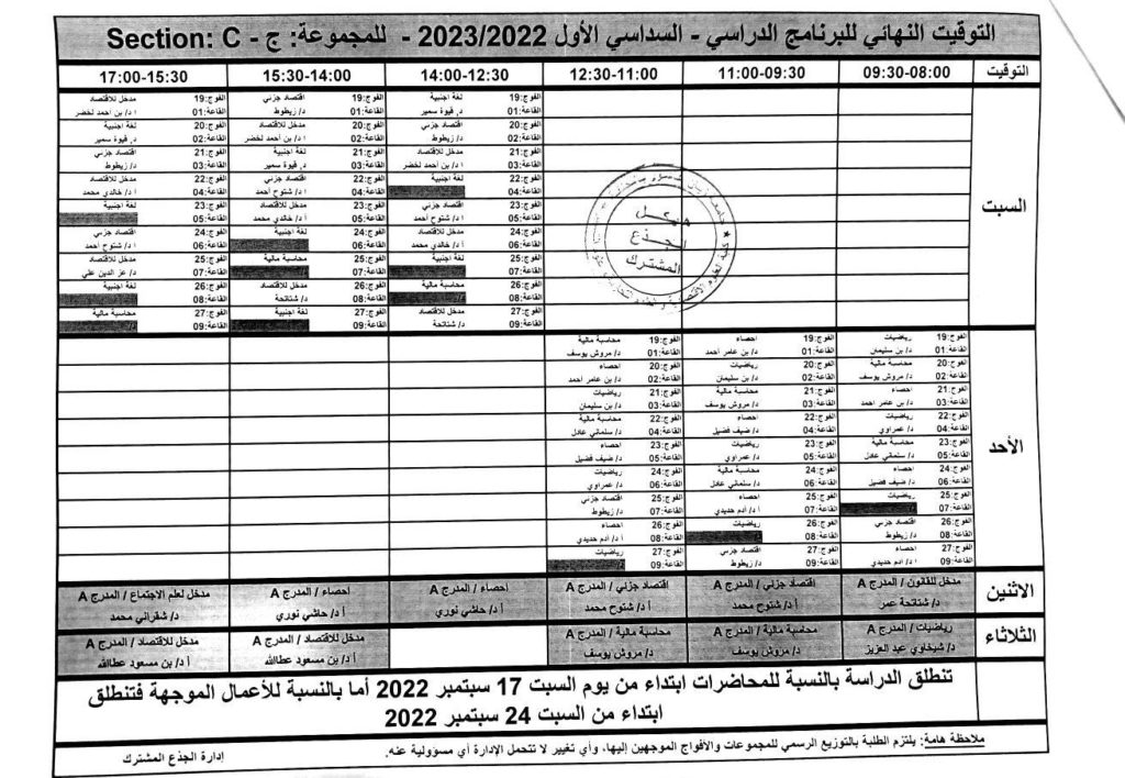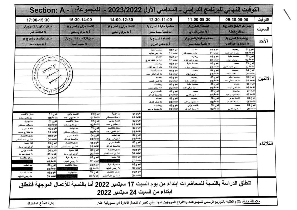 التوقيت الدراسي للسداسي الاول 2022-2023 للسنة أولى جذع مشترك