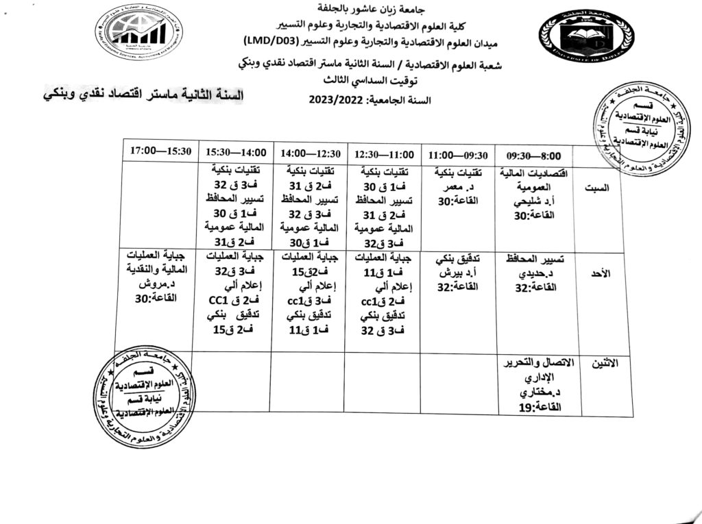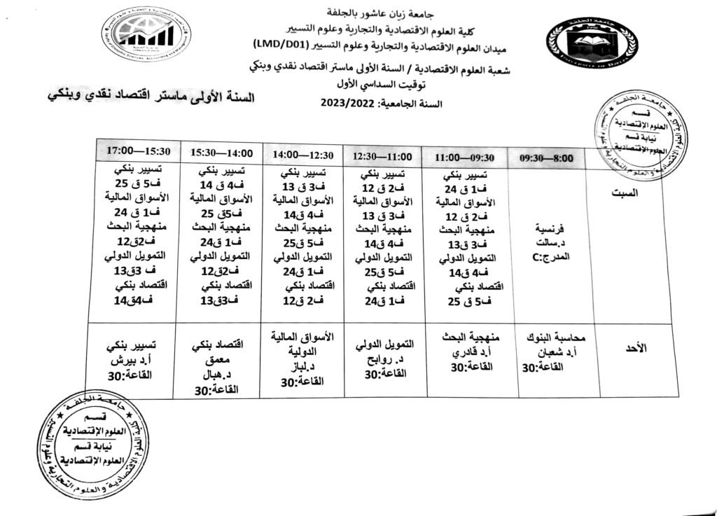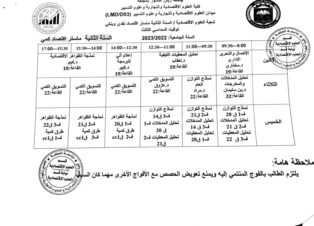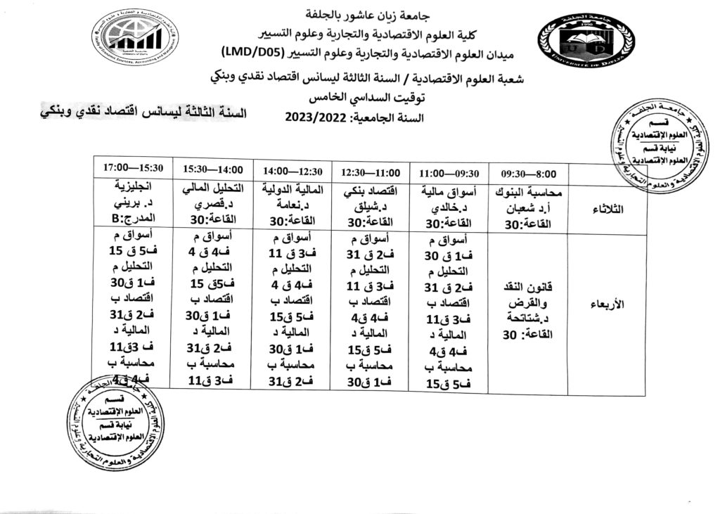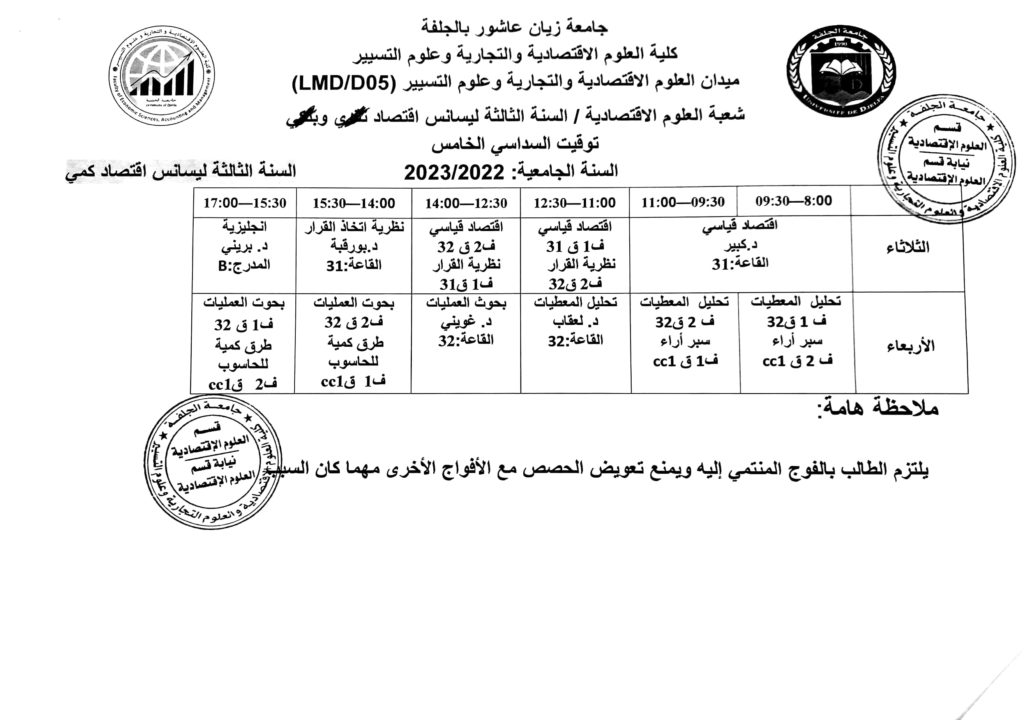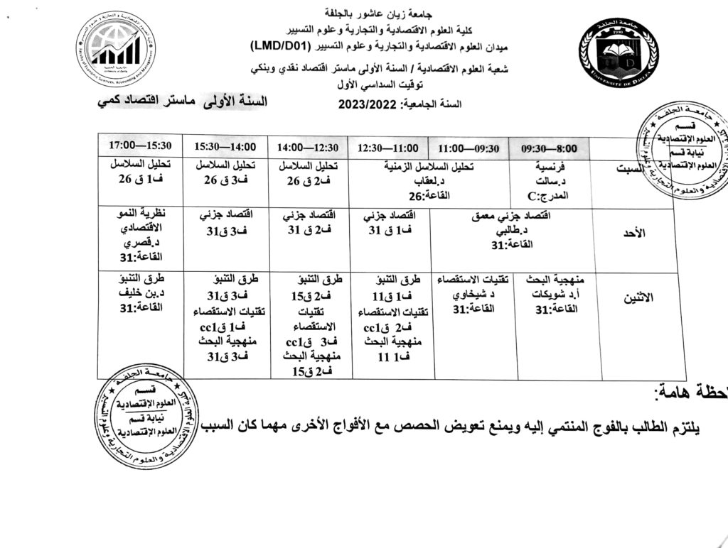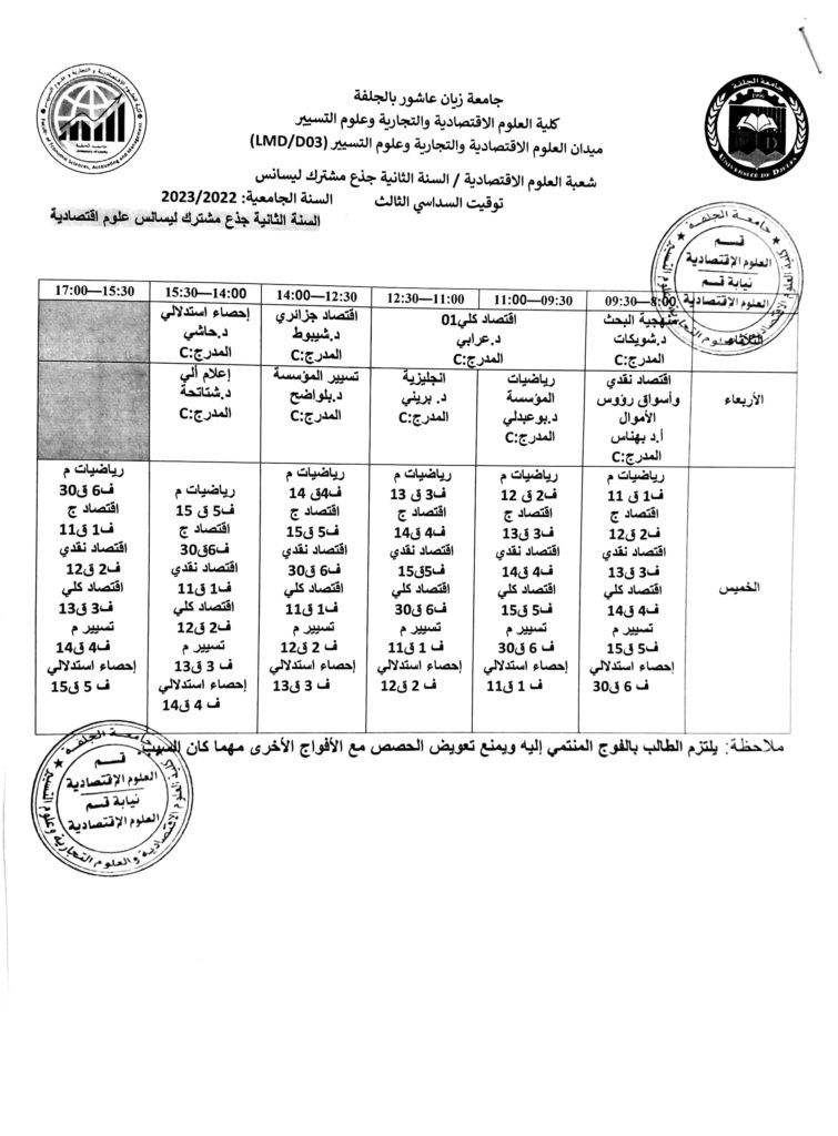 توقيت السداسي الأول 2022-2023 لطلبة قسم العلوم الاقتصادية جميع المستويات