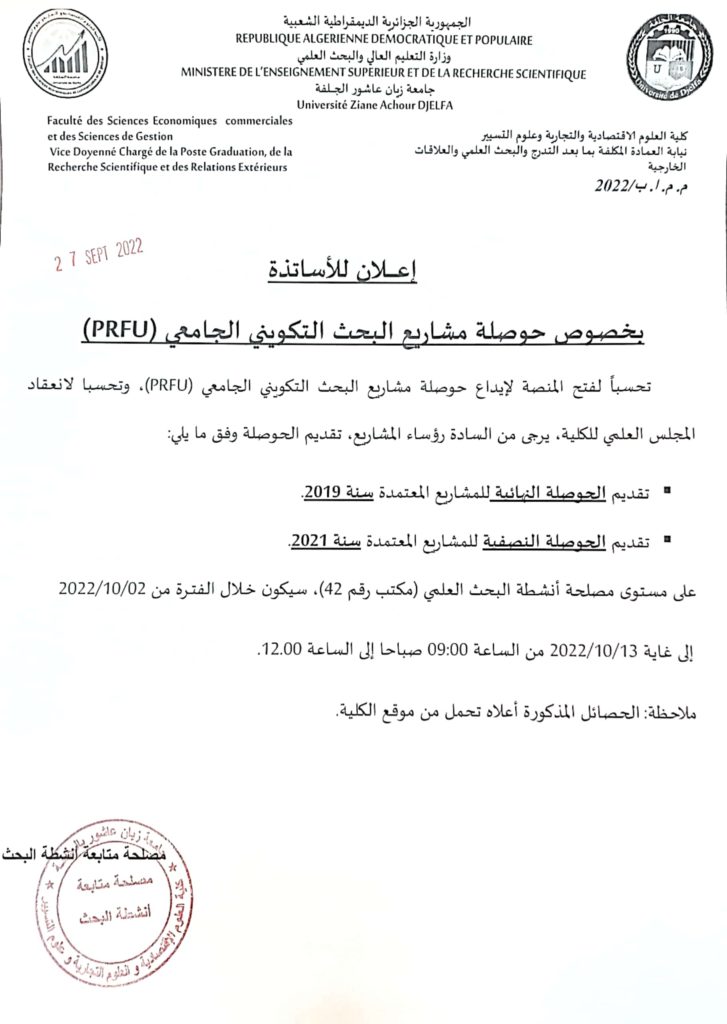 إعلان للأساتذة بخصوص مشاريع البحث التكويني الجامعي (PRFU)