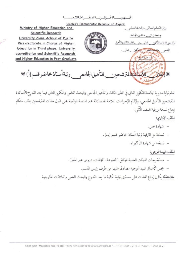 إعلان للأساتذة المترشحين للتأهيل الجامعي رتبة أستاذ محاضر قسم ” أ”