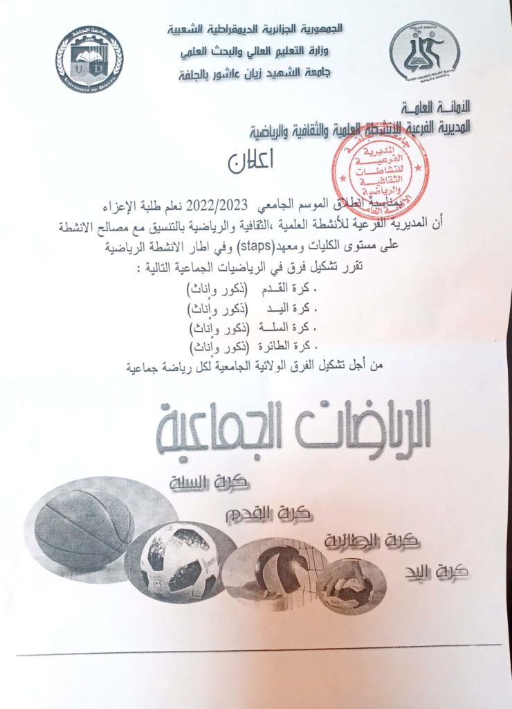إعلان المديرية الفرعية للأنشطة العلمية، الثقافية والرياضية