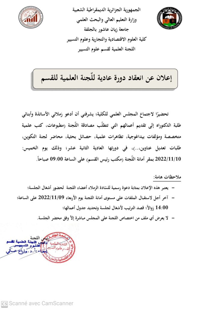 إعلان عن إنعقاد دورة عادية للجنة العلمية لقسم علوم التسيير