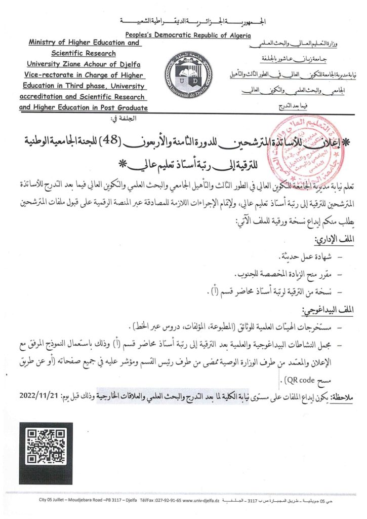 إعلان للأساتذة المترشحين للدورة الثامنة والأربعون (48) للجنة الجامعية الوطنية للترقية إلى رتبة أستاذ التعليم العالي