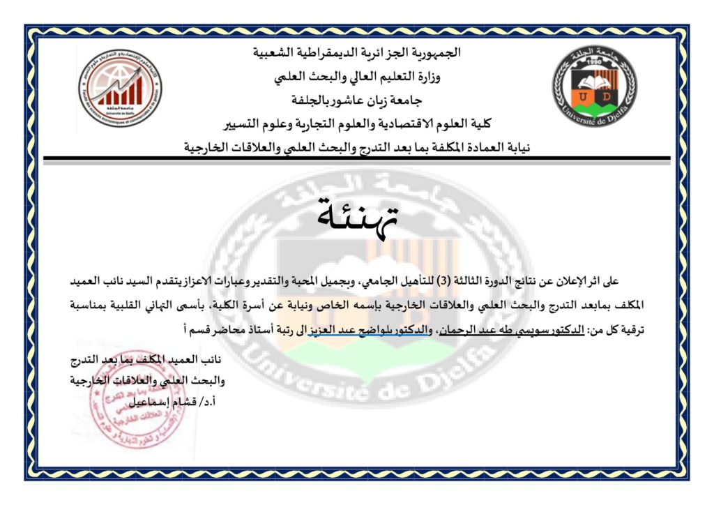 تهنئة للسادة الأساتذة كل من الدكتور طه سوسي عبد الرحمن والدكتور بلواضح عبد العزيز بمناسبة الترقية إلى رتبة أستاذ محاضر قسم أ