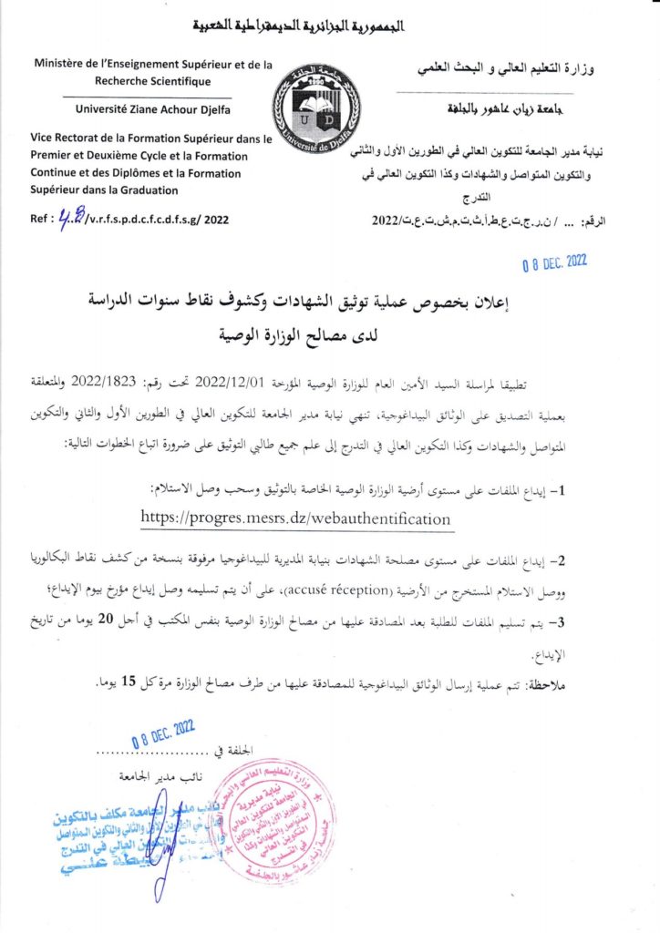 إعلان بخصوص عملية توثيق الشهادات وكشوف نقاط سنوات الدراسة لدى مصالح الوزارة الوصية