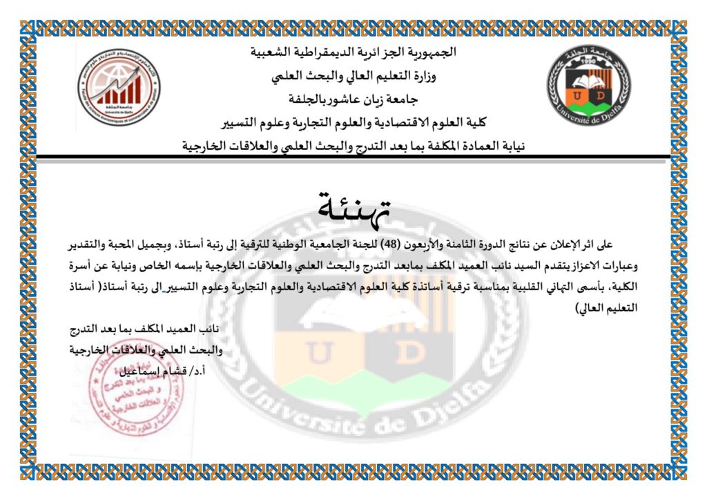 تهنئة بمناسبة ترقية أساتذة الكلية خلال الدورة الثامنة والأربعون، إلى مرتبة الاستاذية التي عقدتها اللجنة الجامعية الوطنية.