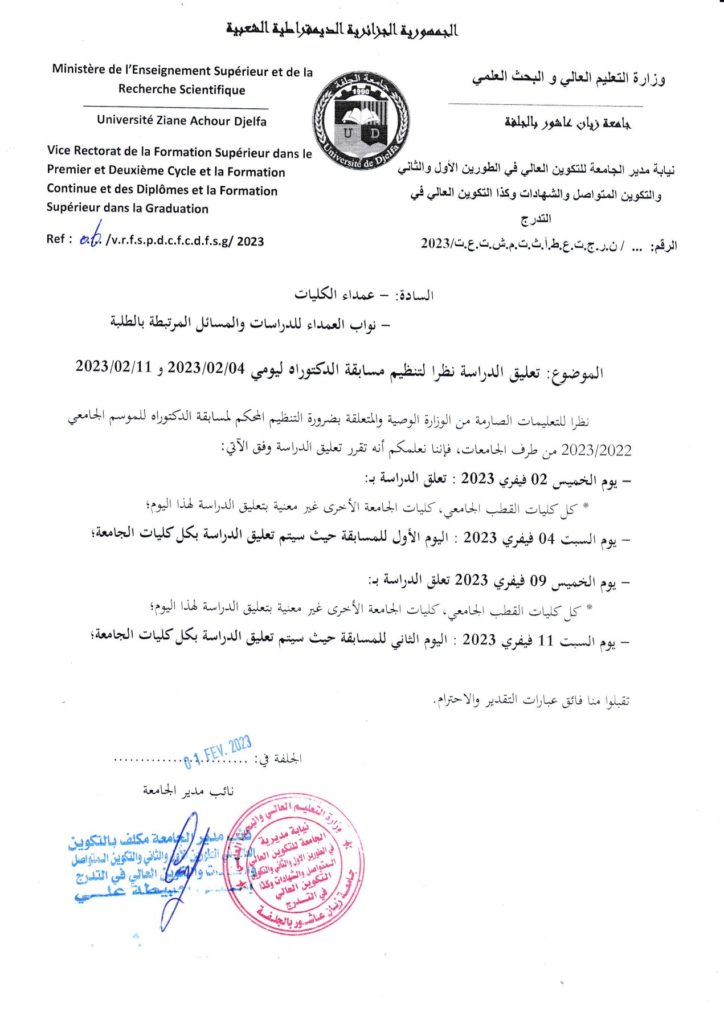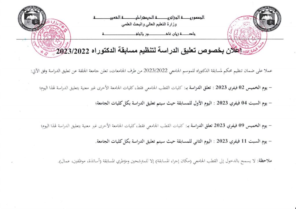 تعليق الدراسة نظرا لتنظيم مسابقة الدكتوراه ليومي 04 02 2023 و 11 02 2023