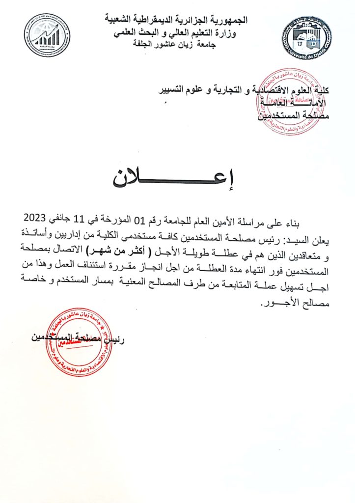 إعلان إلى كافة مستخدمي الكلية من إدارين وأساتذة ومتعاقدين الذين هم في عطلة طويلة الأجل (أكثر من شهر)