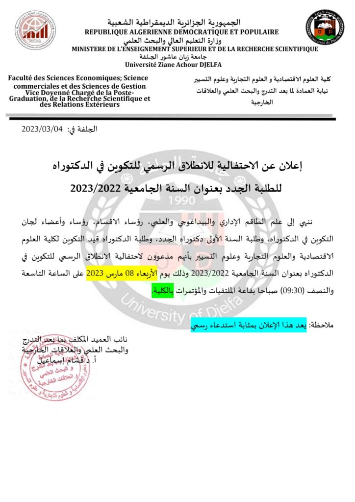 إعلان عن الاحتفالية للانطلاق الرسمي للتكوين في الدكتوراه للطلبة الجدد بعنوان السنة الجامعية 2022/2023
