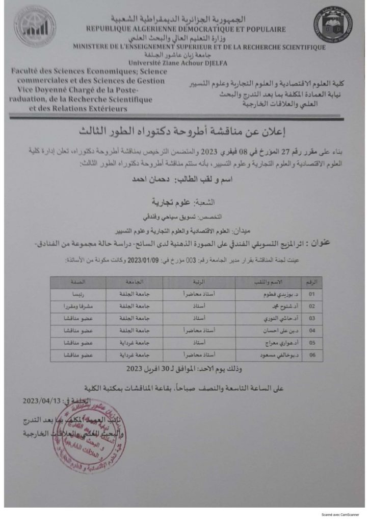 إعلان عن مناقشة أطروحة دكتوراه الطور الثالث للطالب: دحمان احمدبالتوفيق والنجاح