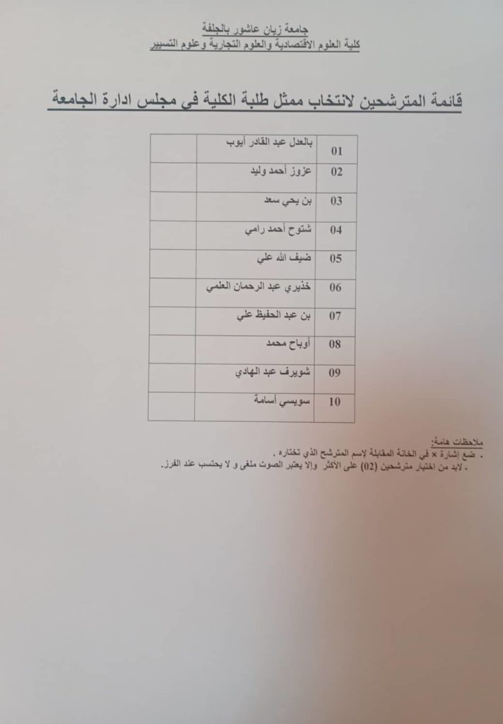 قائمة المترشحين لانتخاب ممثلي طلبة الكلية في مجلس إدارة الجامعة يوم الانتخاب : الخميس 18/05/2023 الساعة : من 09.00 h إلى 14.00 h المكان : المدرج D