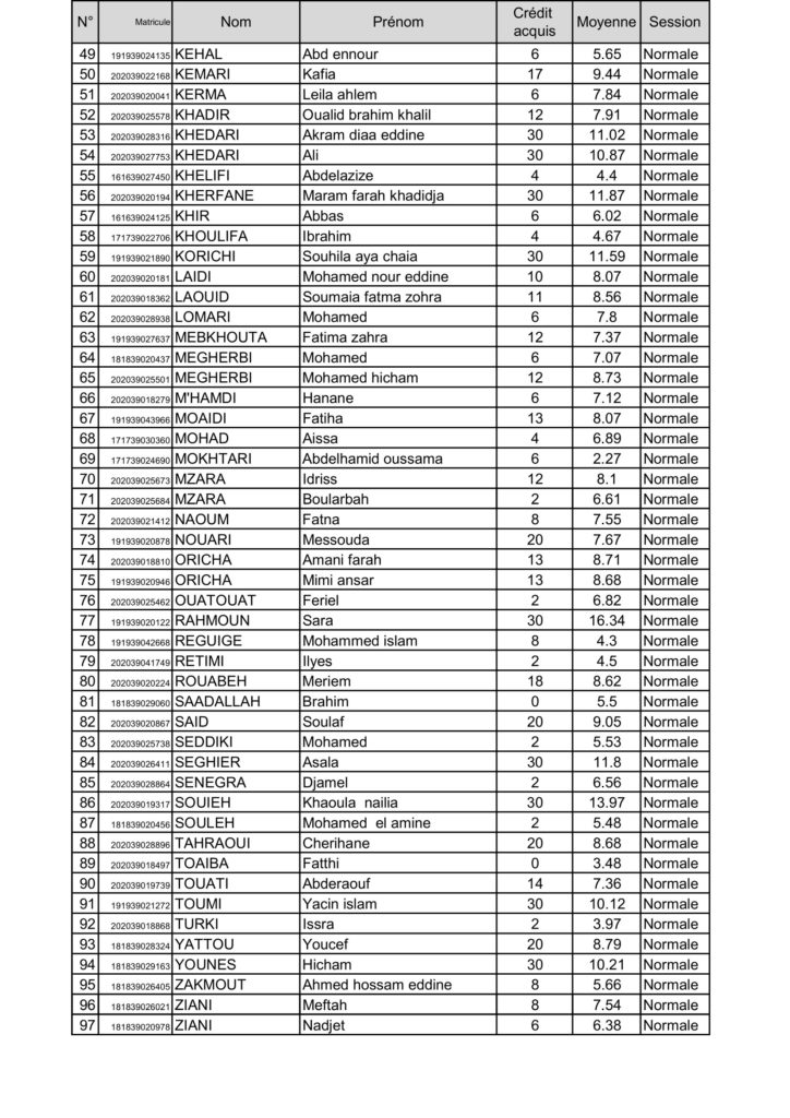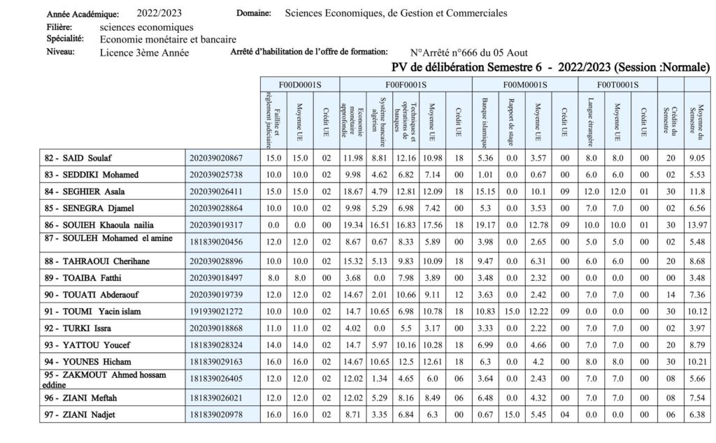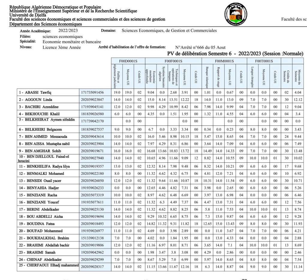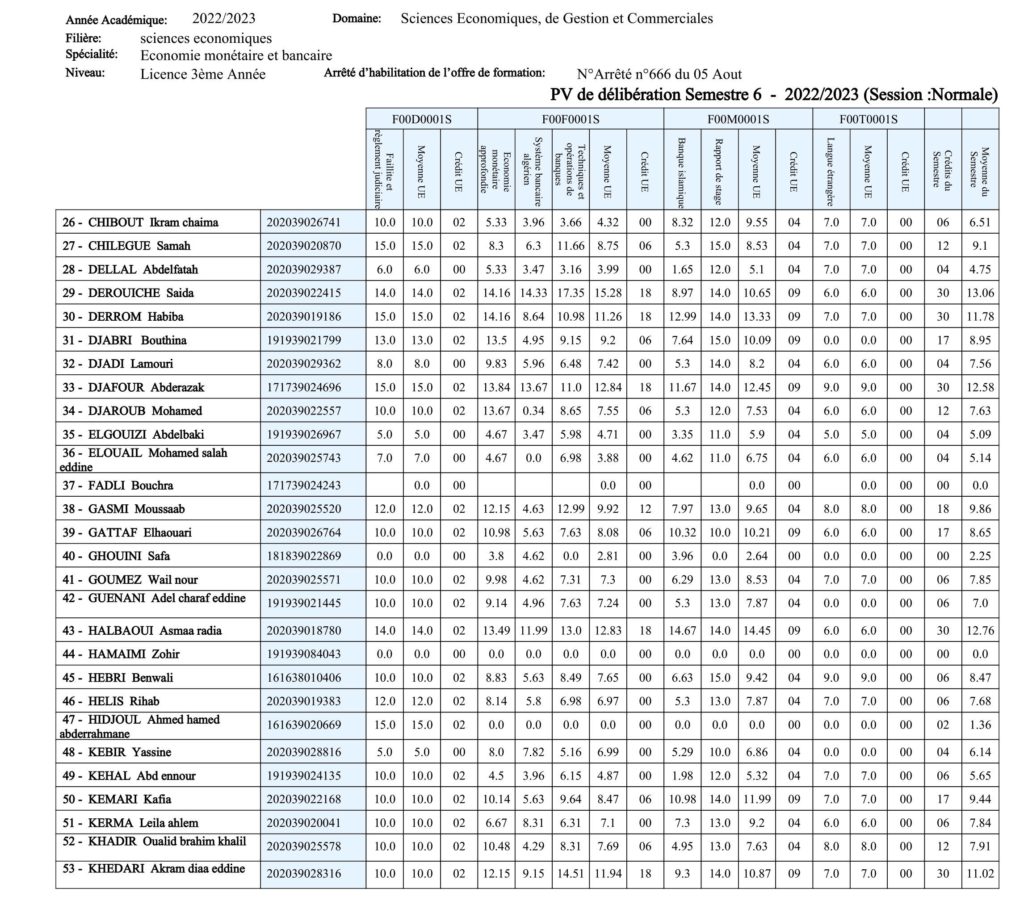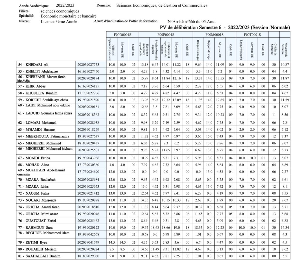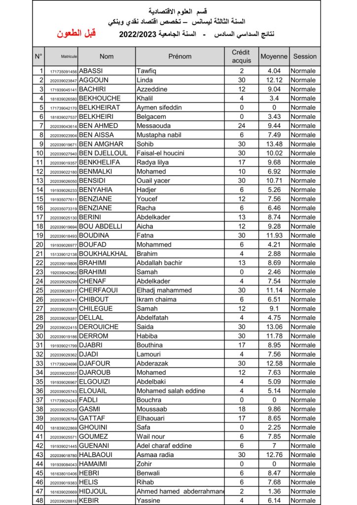 نتائج السداسي السادس – السنة 03 ليسانس تخصص اقتصاد نقدي وبنكي – 2023/2022، قبل الطعون.