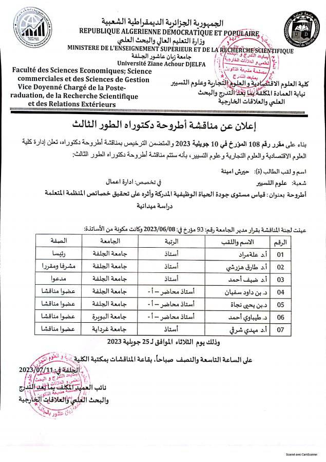 إعلان عن مناقشة أطروحة دكتوراه الطور الثالث للطالبة : حيرش امينة