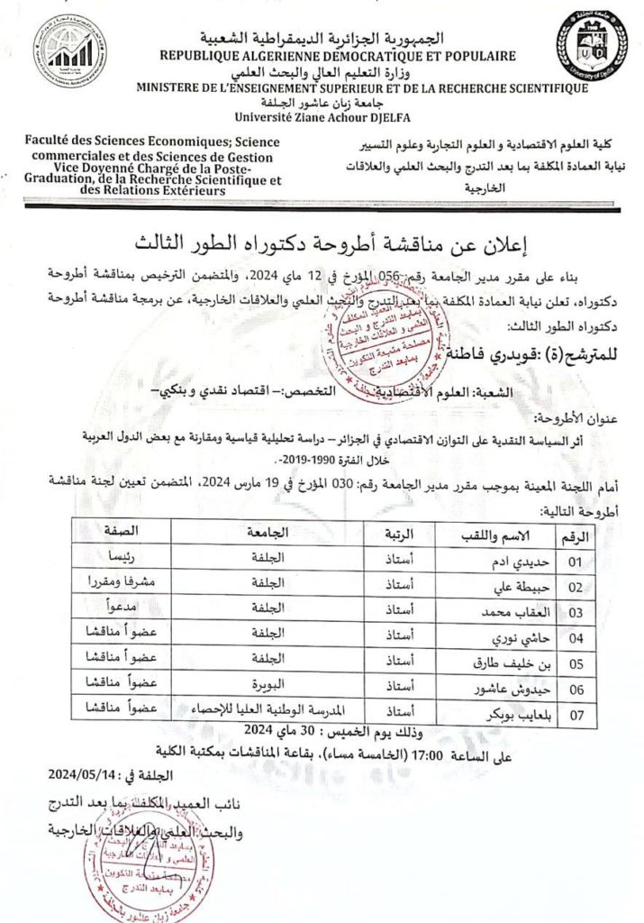 إعلان عن مناقشة أطروحة دكتوراه الطور الثالث للطالب : قويدري فاطنة