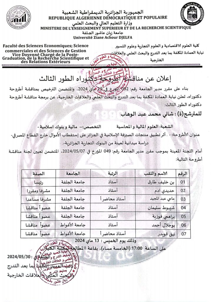 إعلان عن مناقشة أطروحة دكتوراه الطور الثالث للطالب : شاني محمد عبد