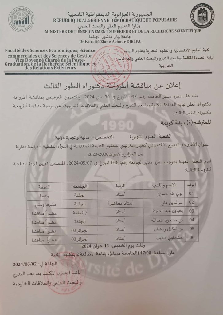 إعلان عن مناقشة أطروحة دكتوراه الطور الثالث للطالب : بقة كريمة