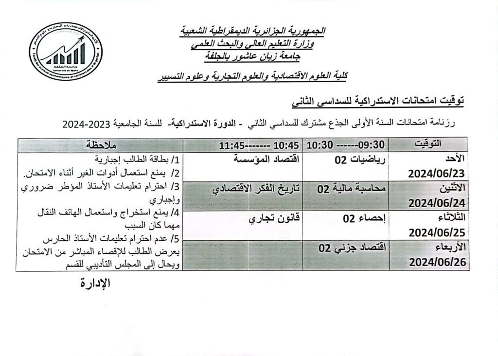 توقيت الامتحانات الاستدراكية السداسي الثاني للسنة اولى جذع مشترك للسنة الجامعية 2023-2024