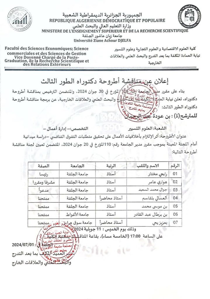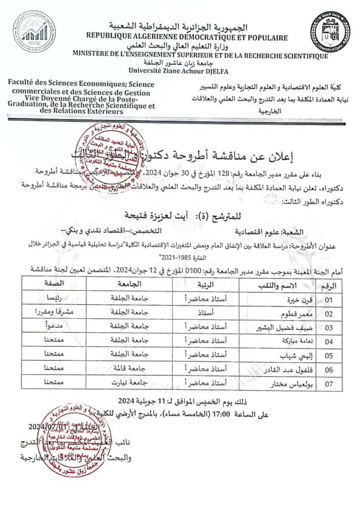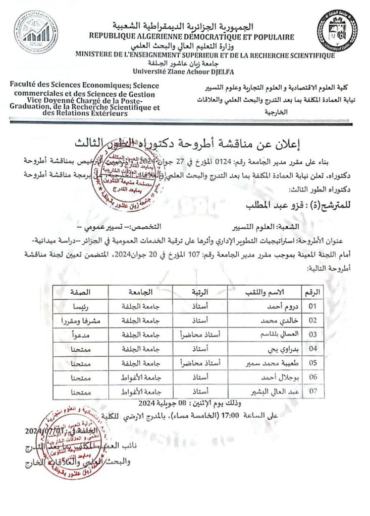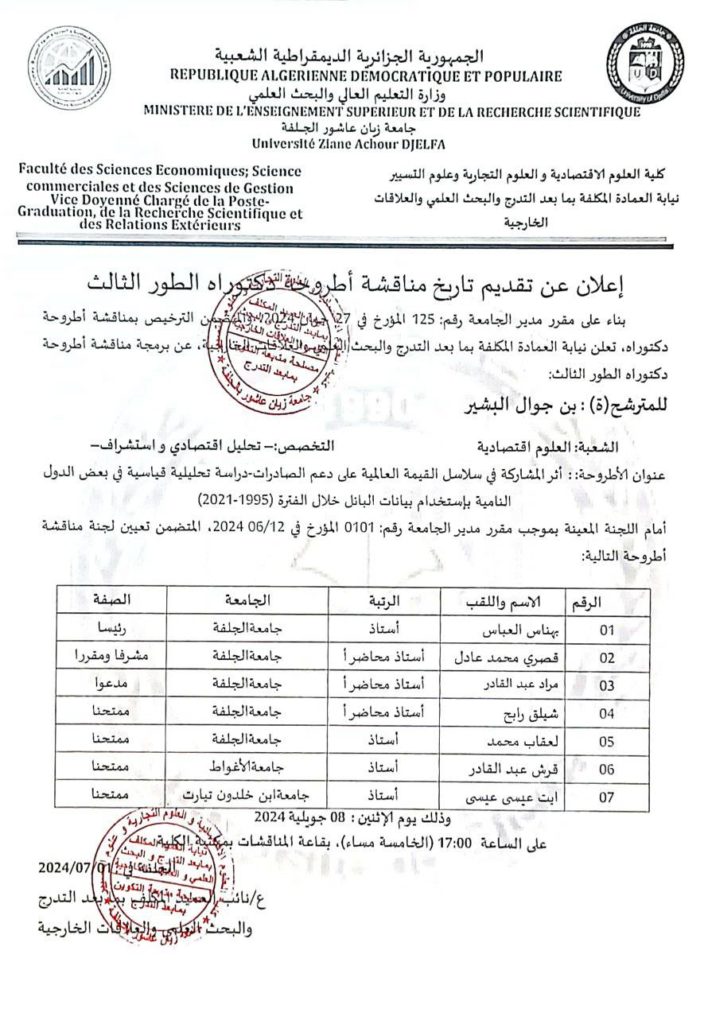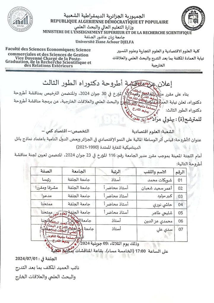 إعلان عن مناقشة أطروحة دكتوراه الطور الثالث للطالب