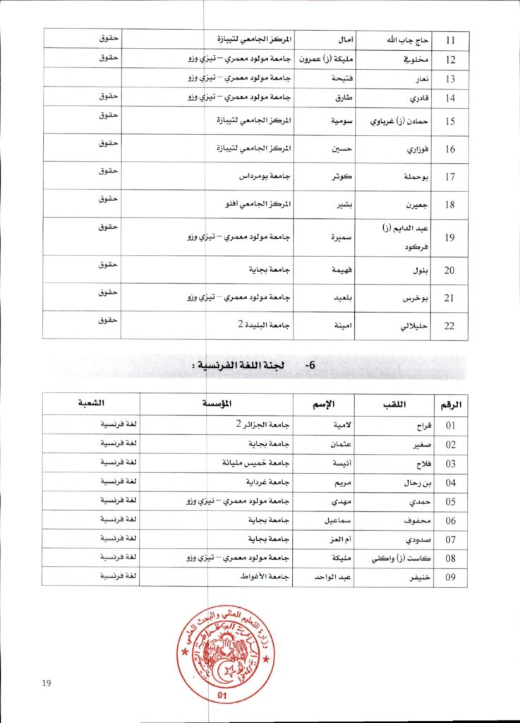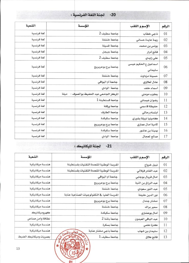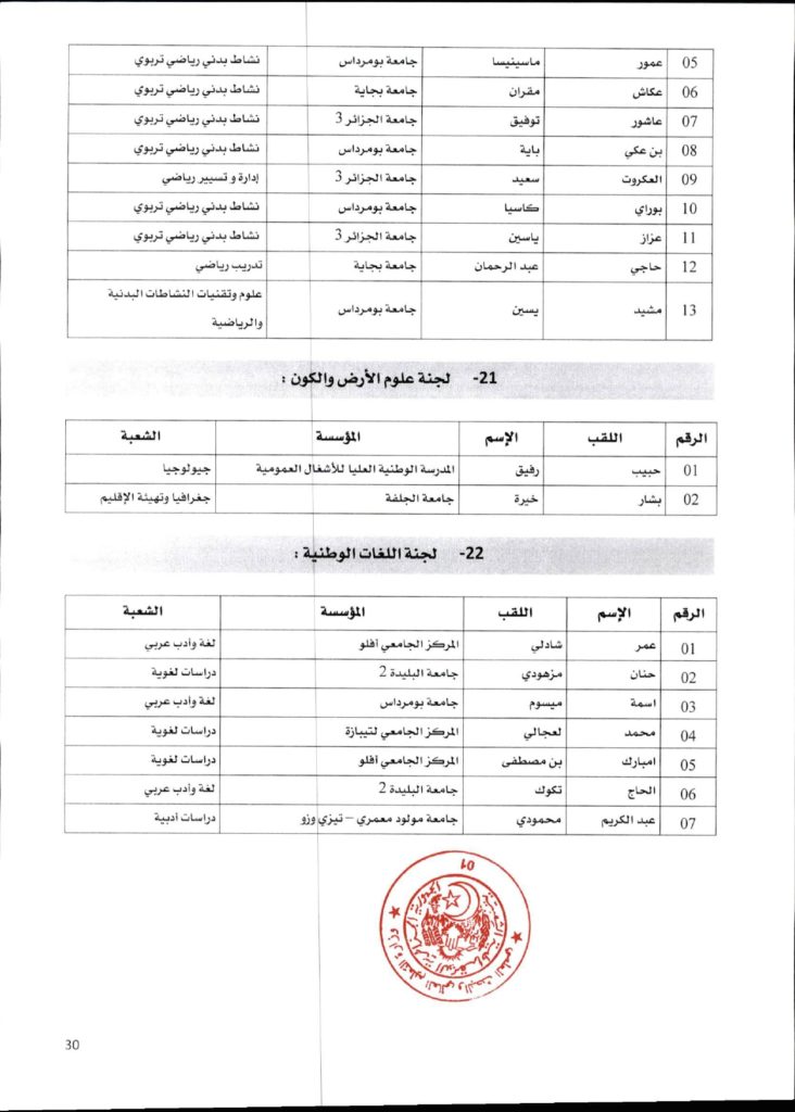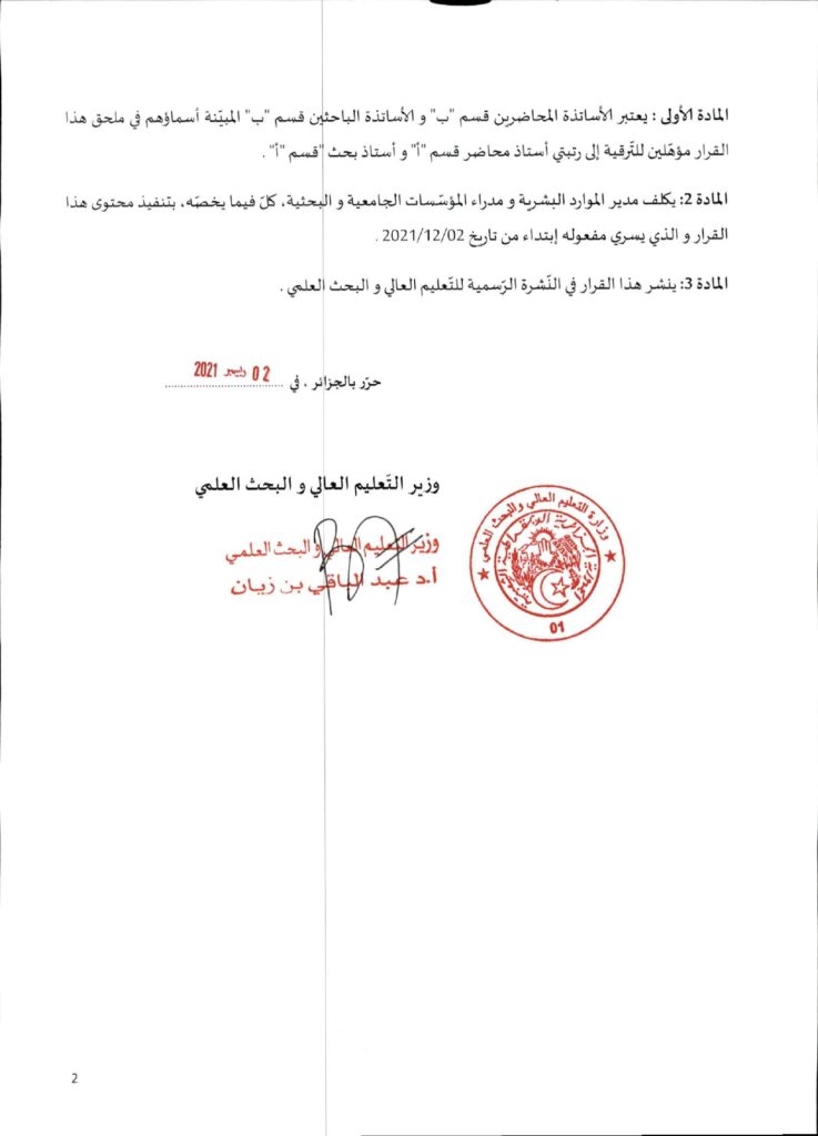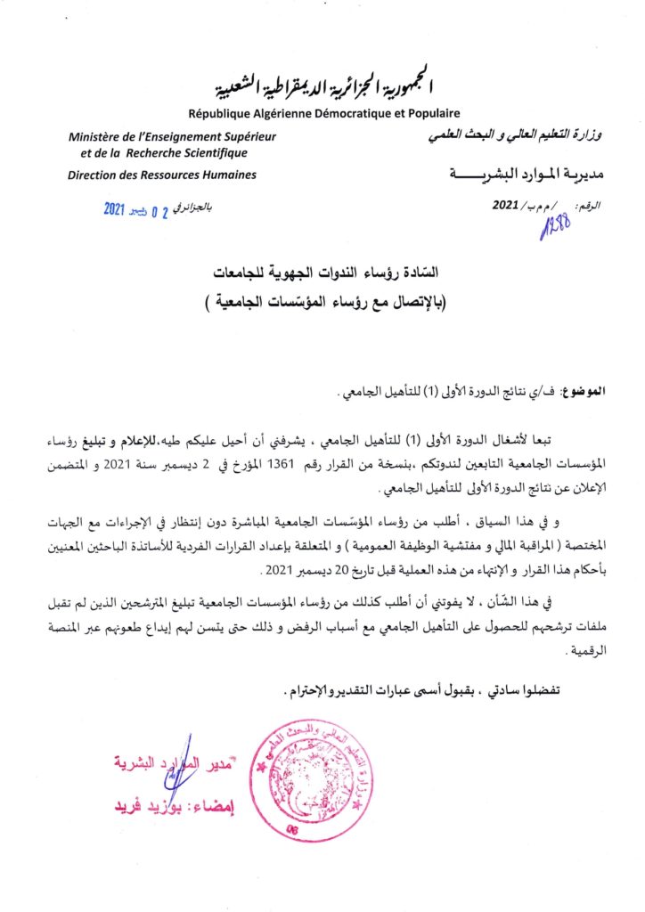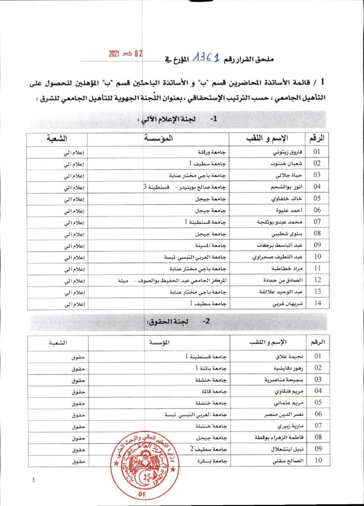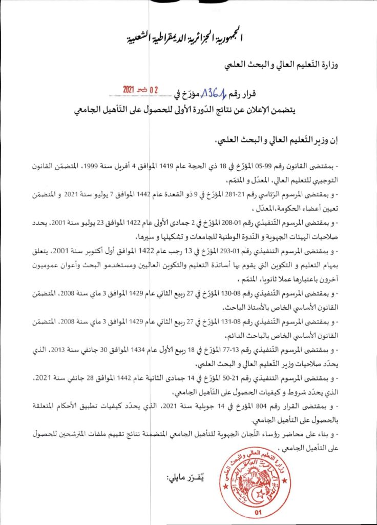 قرار وزاري رقم 1361 مؤرخ في 02 ديسمبر 2021 يتضمن الإعلان عن نتائج الدورة الأولى للحصول على التأهيل الجامعي