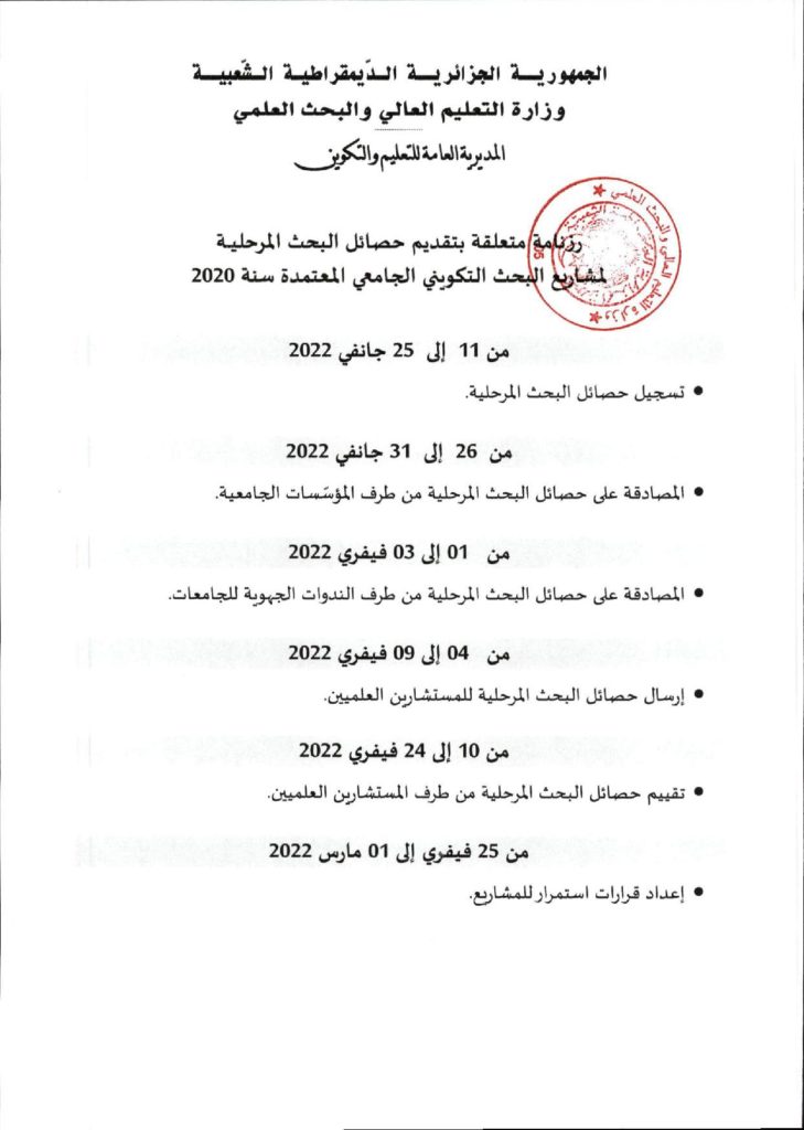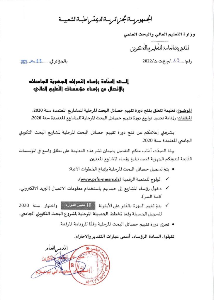 فتح دورة تقييم حصائل البحث المرحلية للمشاريع المعتمدة سنة 2020
