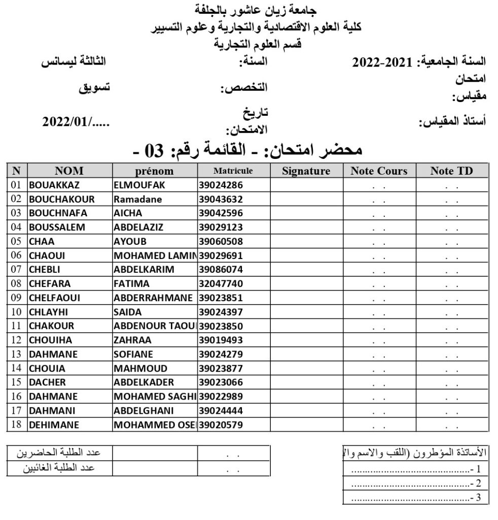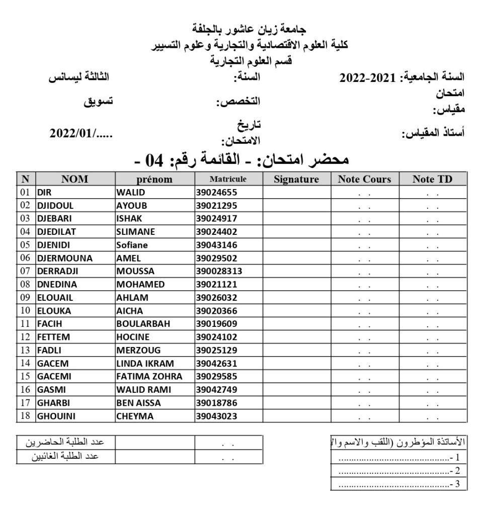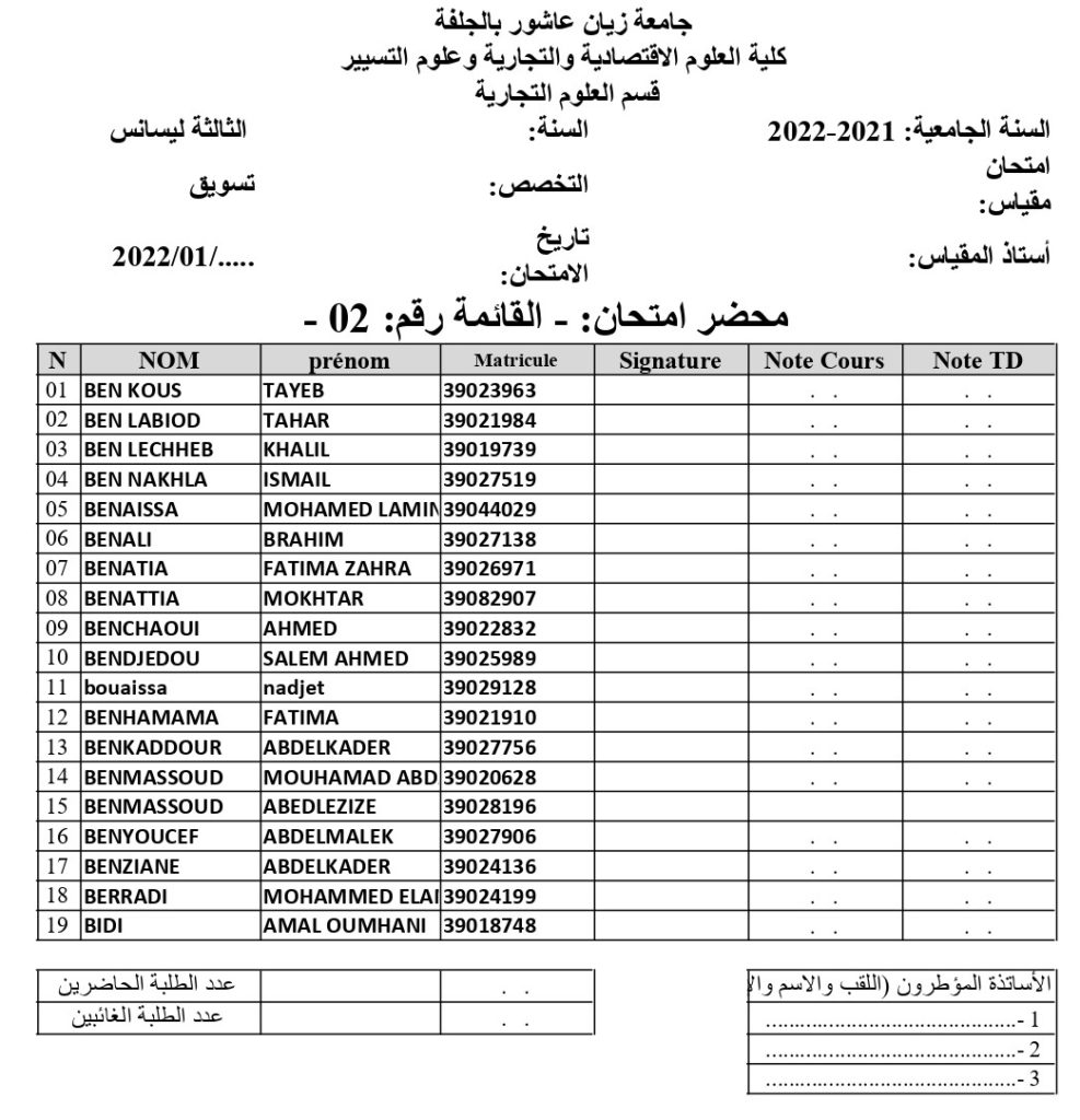 توزيع طلبة قسم العلوم التجارية على قاعات الإمتحان حسب القوائم ملاحظة: من لم يجد اسمه في القائمة يتصل بالادارة يومي الاثنين والثلاثاء
