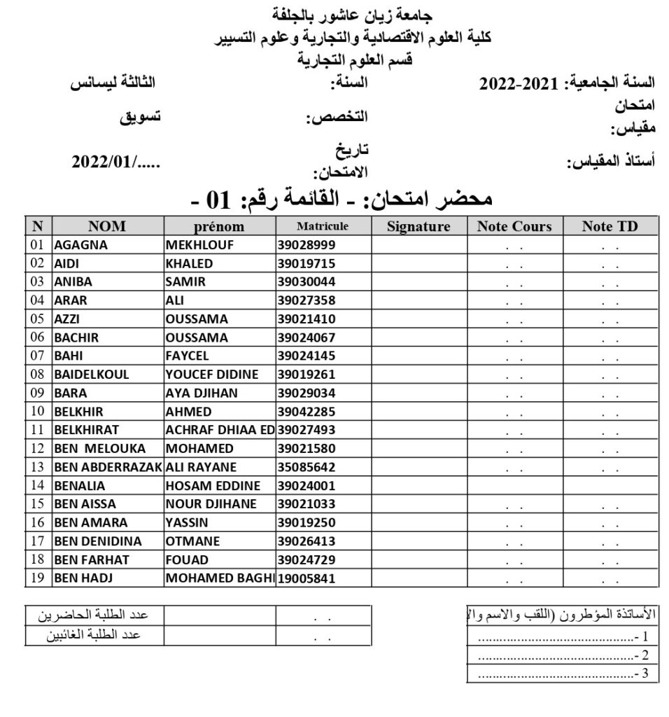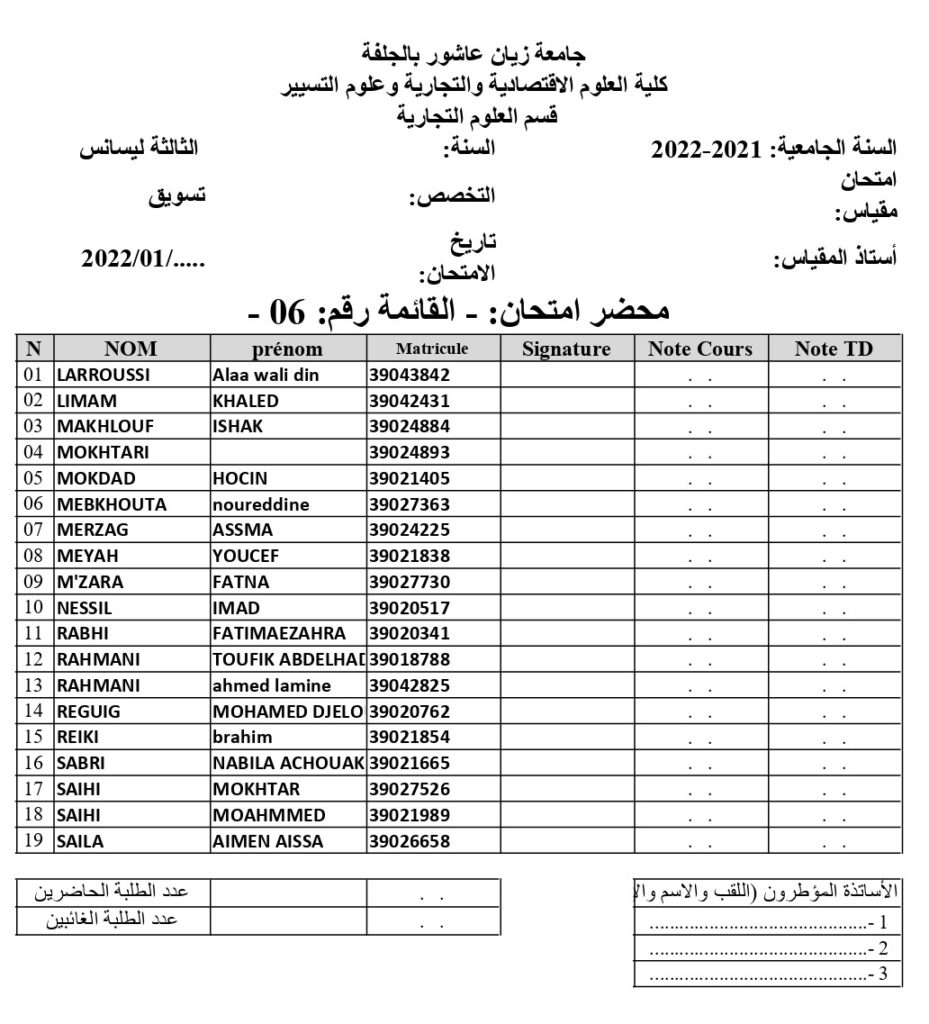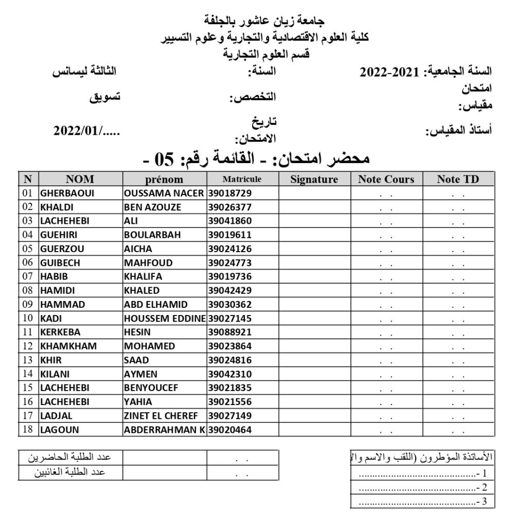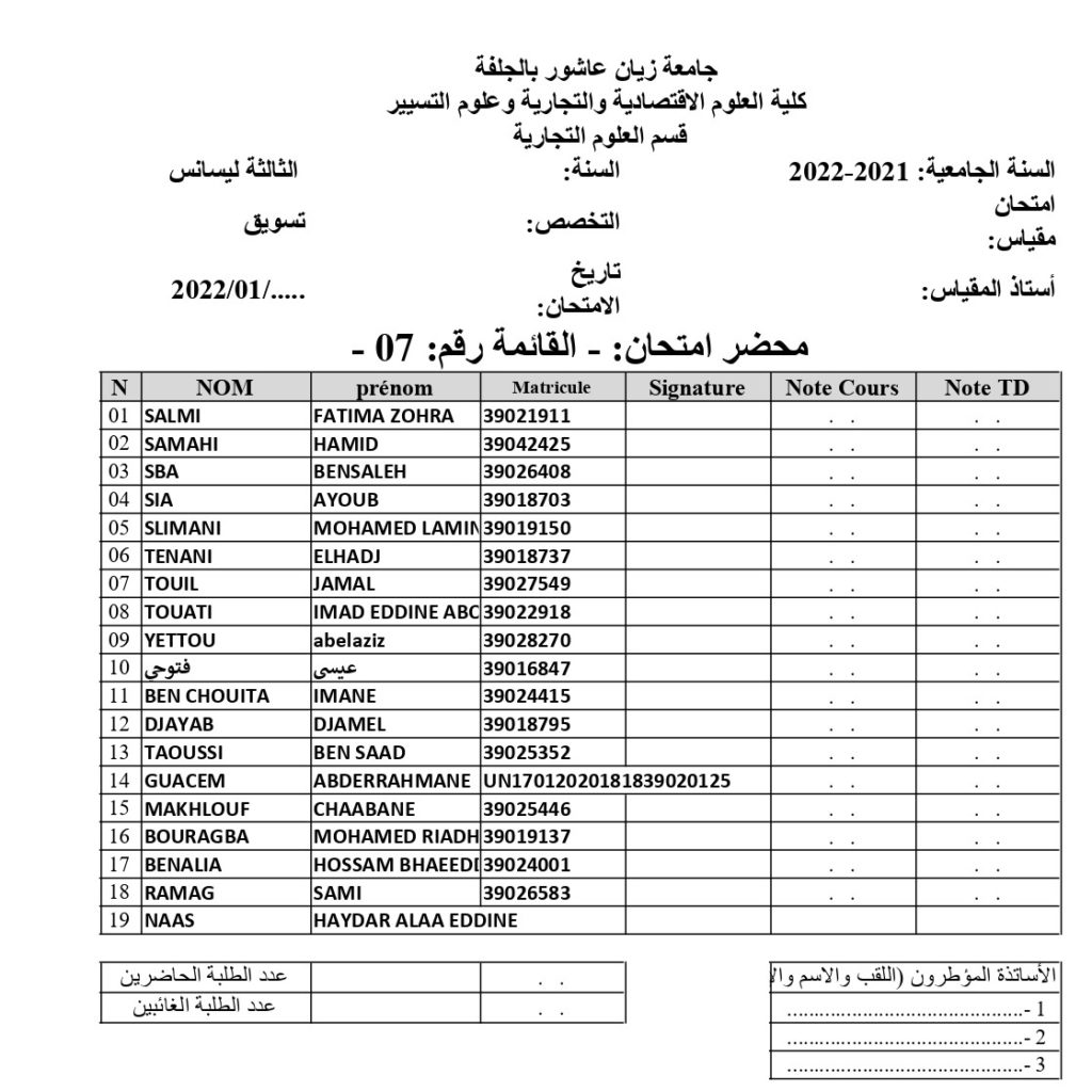 توزيع طلبة قسم العلوم التجارية على قاعات الإمتحان حسب القوائم ملاحظة: من لم يجد اسمه في القائمة يتصل بالادارة يومي الاثنين والثلاثاء