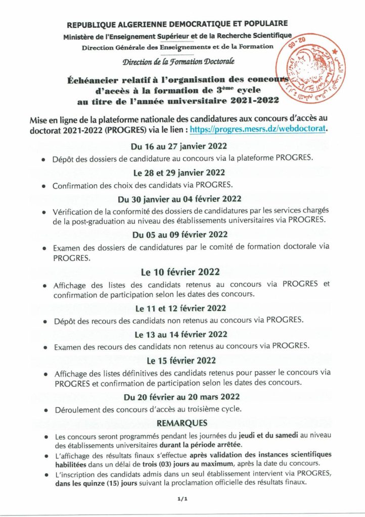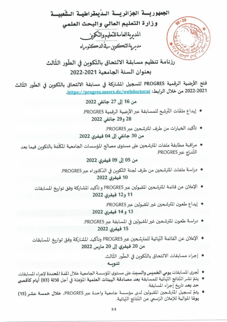 رزنامة تنظيم مسابقة الالتحاق بالتكوين في الطور الثالث بعنوان السنة الجامعية 2021/2022