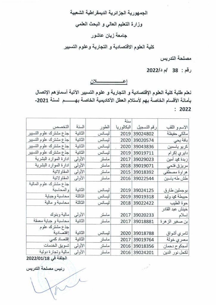 • Next story ملحق القرار رقم 033 المؤرخ في 13 جانفي 2022 والمتضمن تأهيل جامعة الجلفة لضمان التكوين لنيل شهادة الدكتوراه و يحدد عدد المقاعد البيداغوجية المفتوحة بعنوان السنة الجامعية 2022/2021