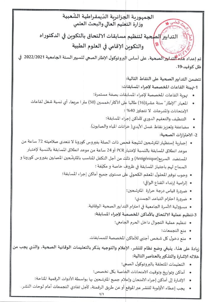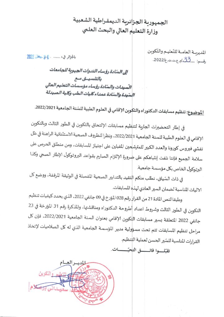 تنظيم مسابقات الدكتوراه والتكوين الاقامي في العلوم الطبية للسنة الجامعية 2022/2021