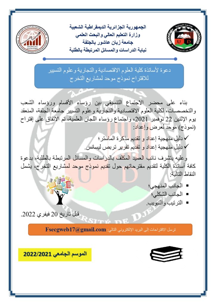 دعوة لأساتذة كلية العلوم الإقتصادية والتجارية وعلوم التسيير لإقتراح نموذج موحد لمشاريع التخرج