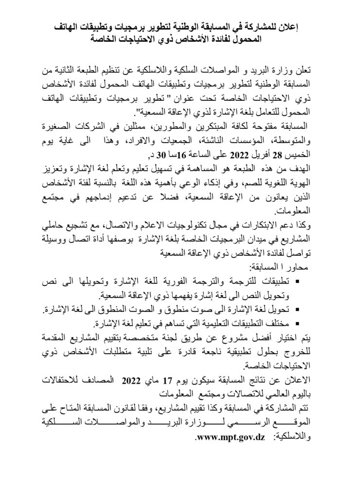 إعلان للمشاركة في المسابقة الوطنية لتطوير برمجيات وتطبيقات الهاتف المحمول لفائدة الشخاص ذوي الإحتياجات الخاصة