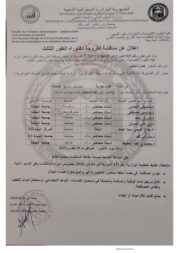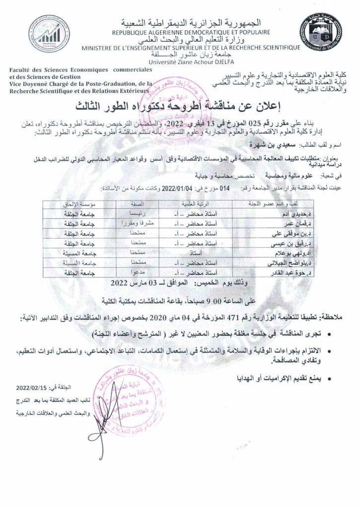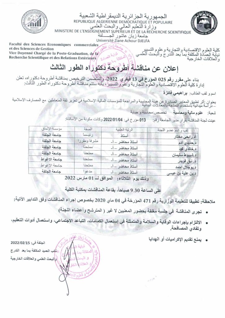 إعلان عن مناقشة أطروحة الدكتوراه الطور الثالث