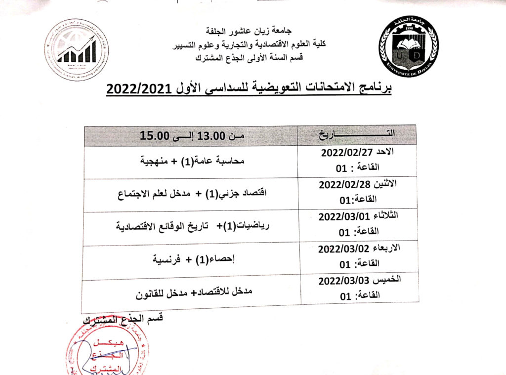 رزنامة الامتحانات التعويضية للسداسي الأول للسنة الجامعية 2022/2021 قسم الجذع المشترك