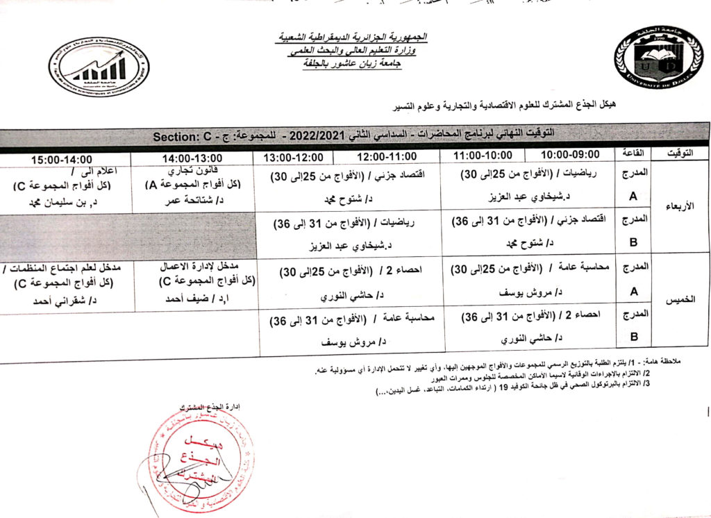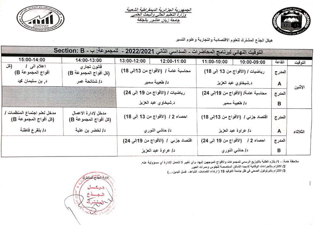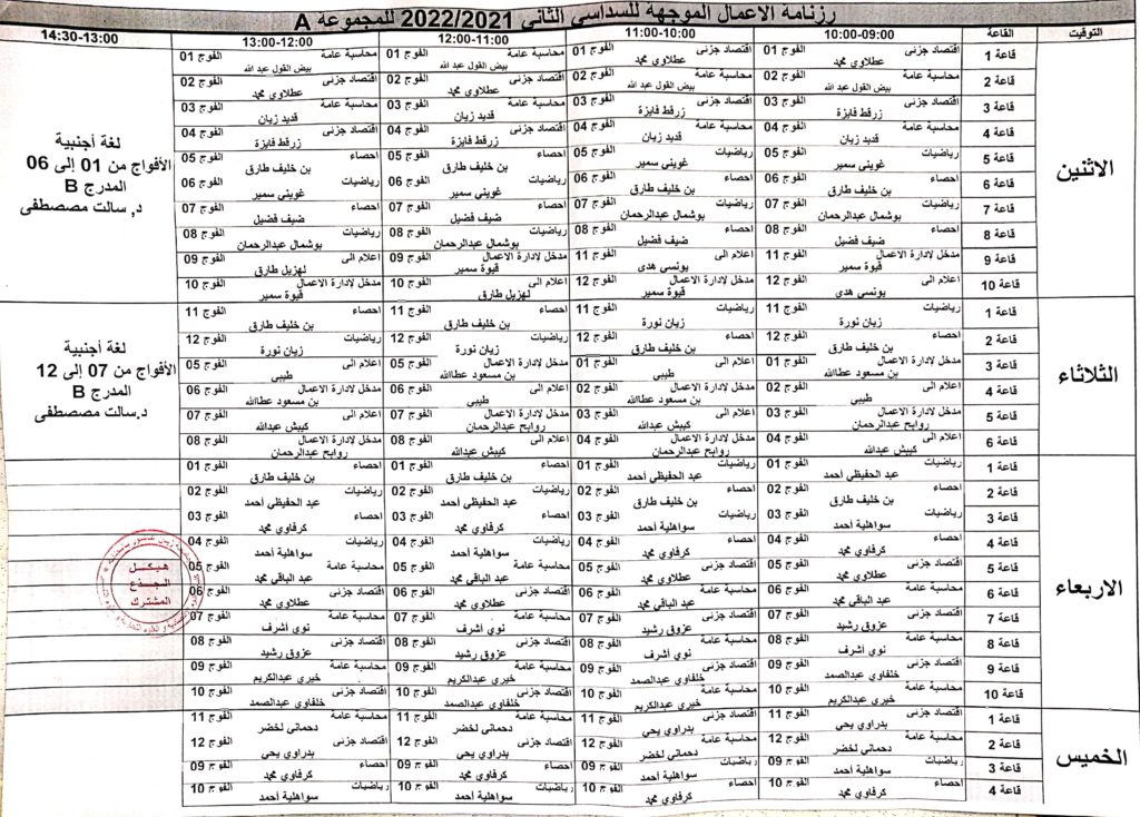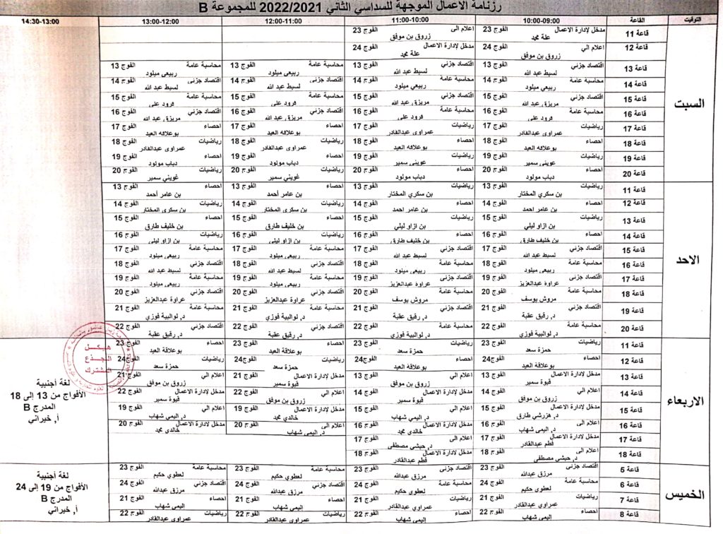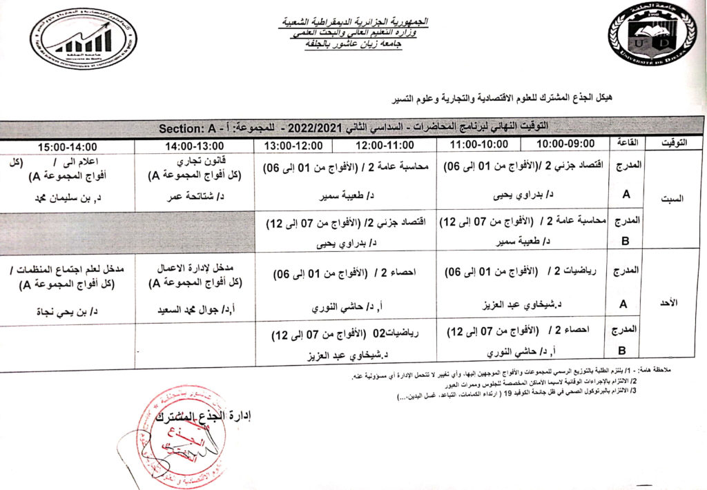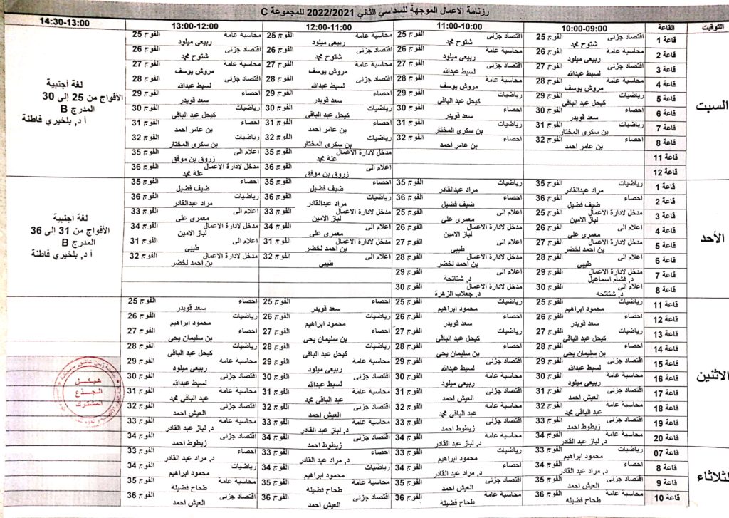 توقيت برنامج المحاضرات والاعمال الموجهة للسداسي الثاني من السنة الجامعية 2022/2021 قسم الجذع المشترك