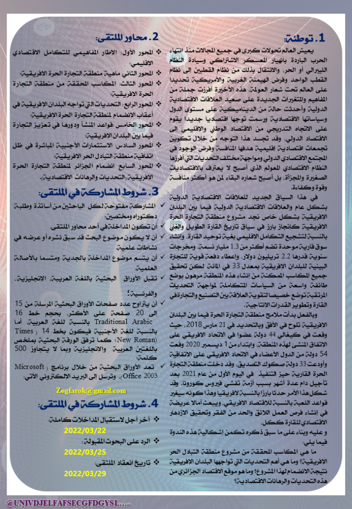 الملتقى الوطني المرسوم بعنوان: منطقة التبادل الحر الإفريقية ..التحديات والرهانات
