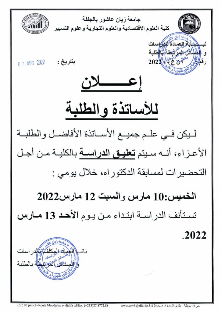 تعليق الدراسة نظرا لتنظيم مسابقة الدكتوراه بالنسبة لكلية العلوم الاقتصادية والعلوم التجارية وعلوم التسيير