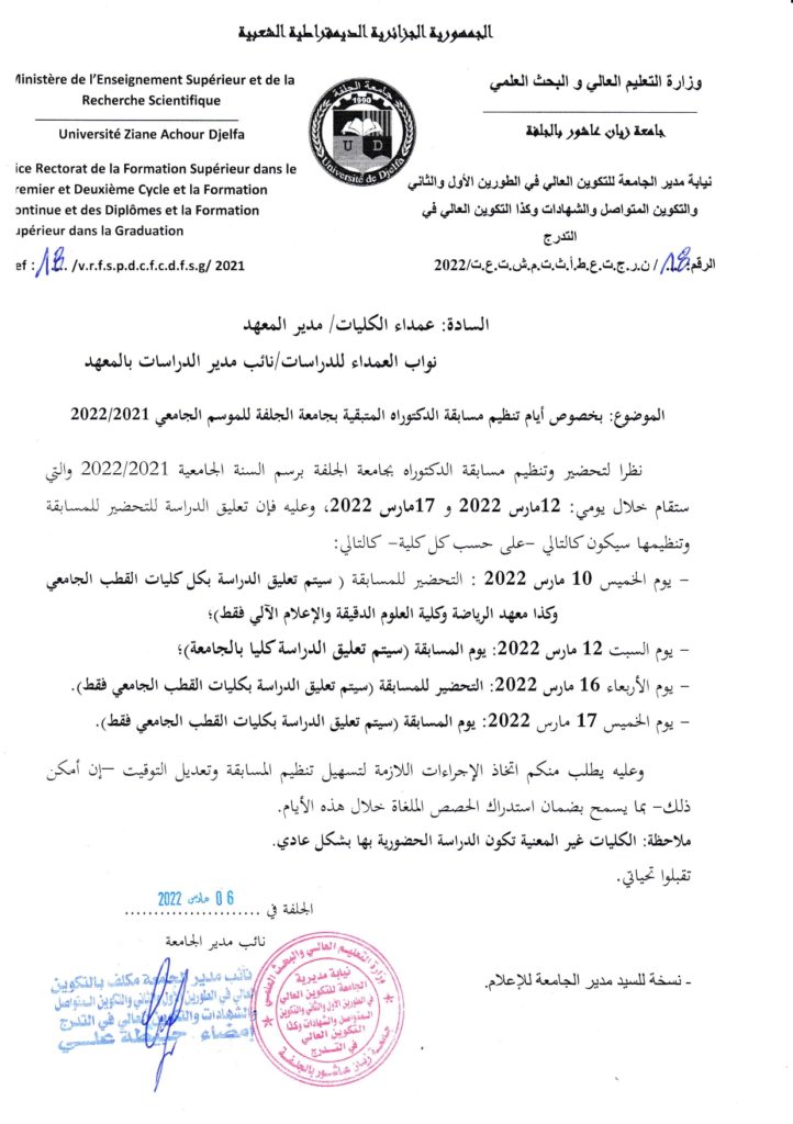 بخصوص أيام تنظيم مسابقة الدكتوراه المتبقية بجامعة الجلفة للموسم الجامعي 2022/2021